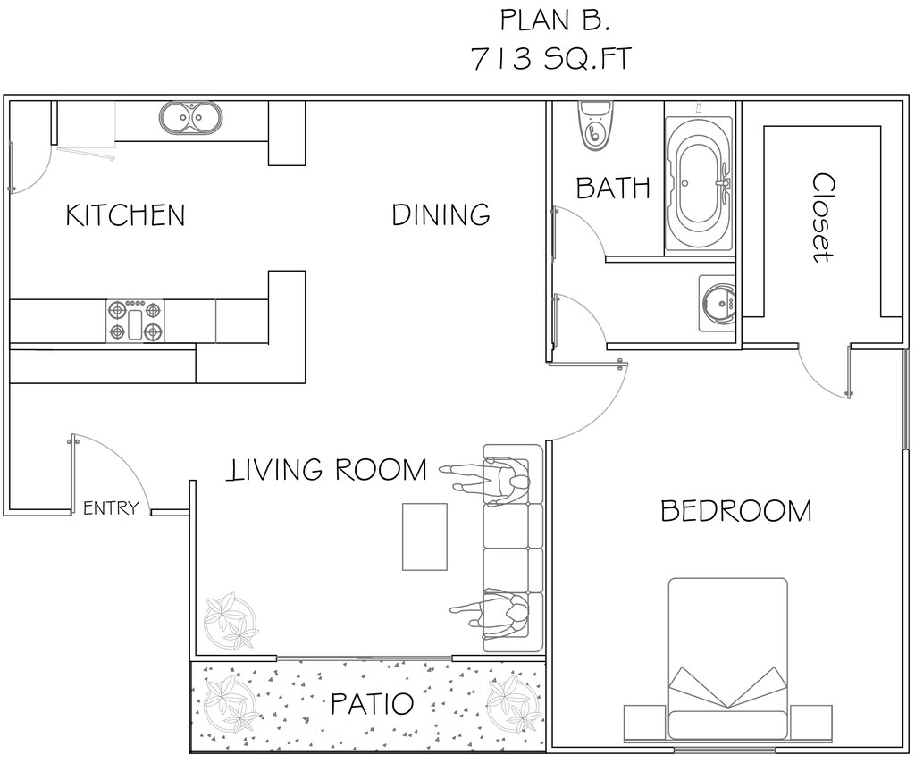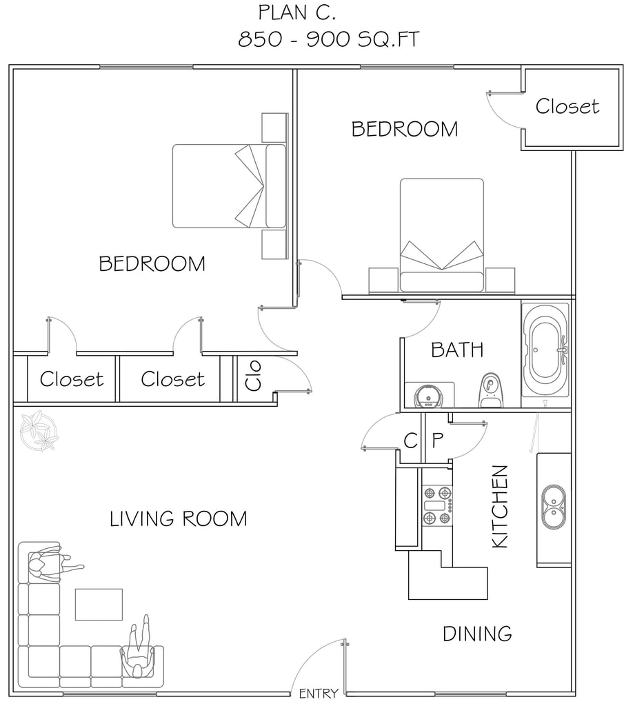Modelo de apartamento: 900 sfLlame para Precios2 Dormitorios, 1 Baño, 900 sq ftNo Disponible![]()