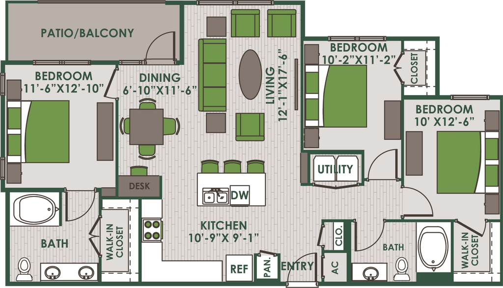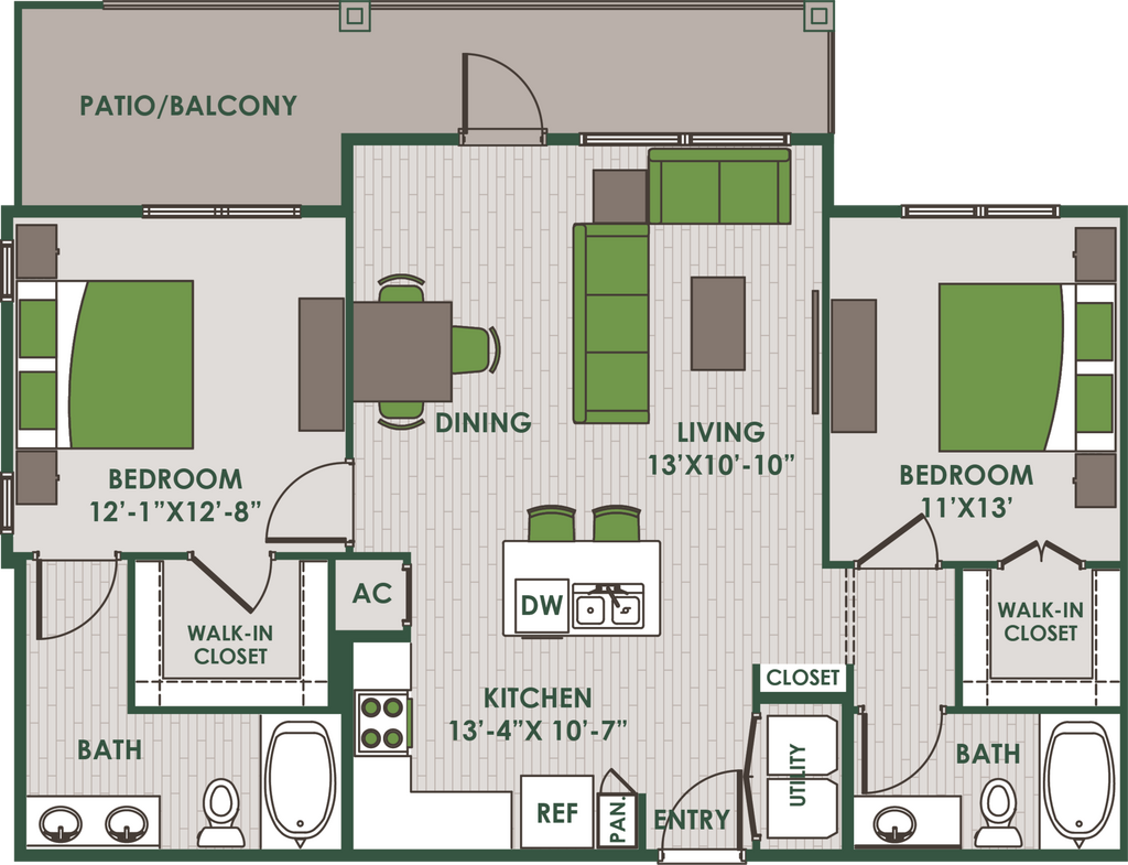 Modelo de apartamento: A2Desde $1,4291 Dormitorio, 1 Baño, 798 sq ftDisponible Ahora![]()