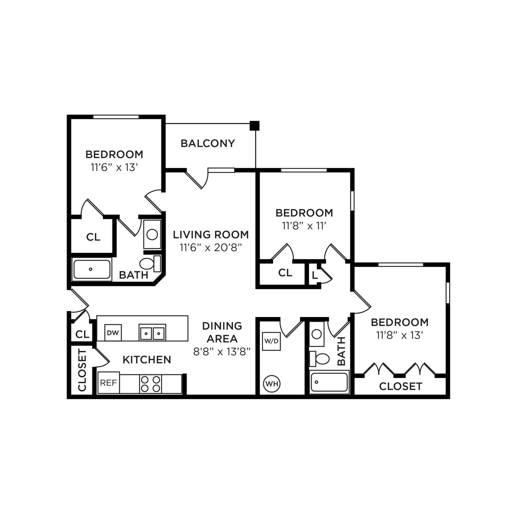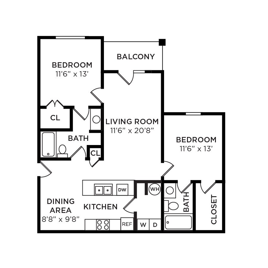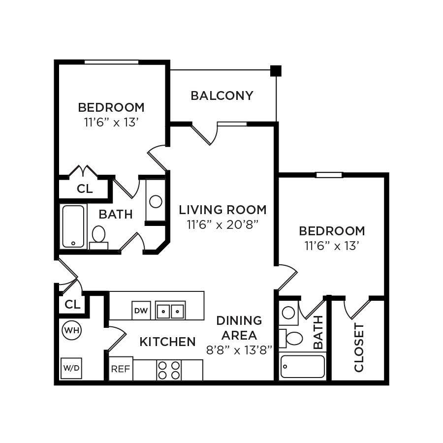 Modelo de apartamento: Two BedroomDesde $1,5702 Dormitorios, 2 Baños, 1076-1139 sq ftDisponible Ahora![]()