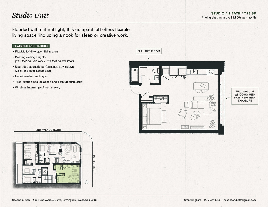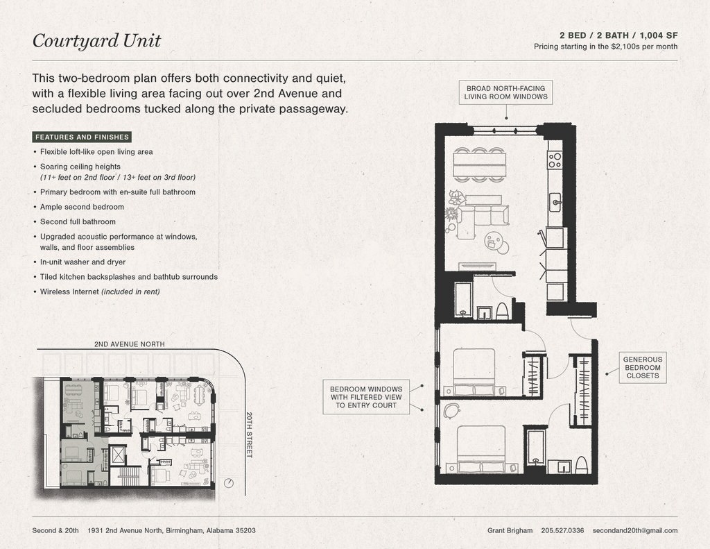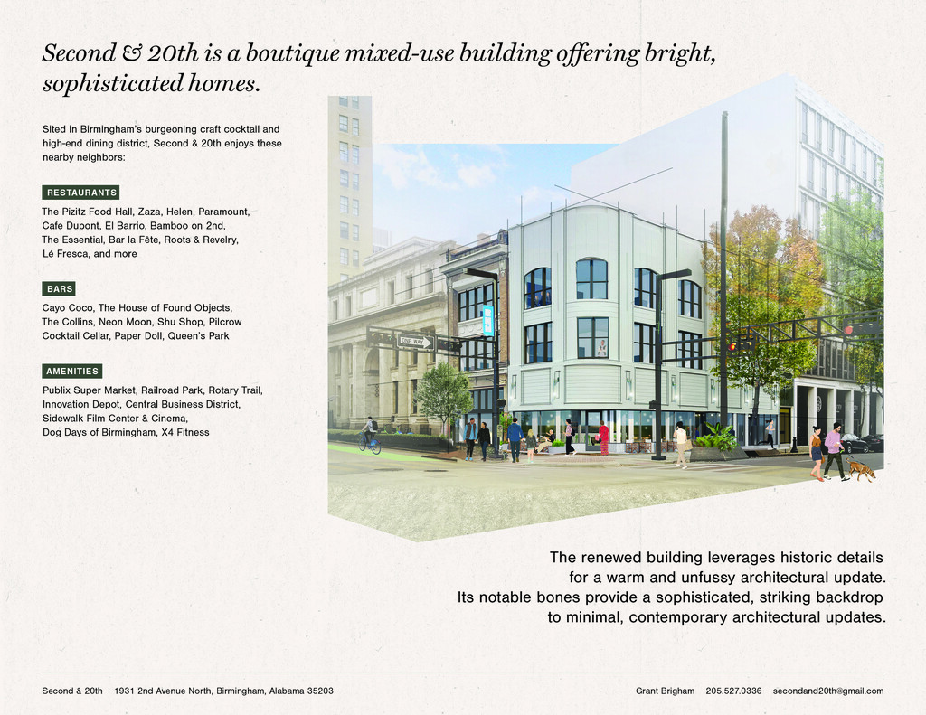 Ubicado en la esquina de 2nd Avenue North y 20th Street, este renovado edificio del centro de la ciudad ofrece detalles históricos para crear seis modernas residencias de apartamentos junto con un patio urbano y dinámico rincón de tiendas de venta al por menor. Cada nivel ofrece la opción de una residencia en esquina, patio o estudio, todas caracterizadas por planos de planta ventilados, detalles simples pero sofisticados y materiales auténticos y naturales.