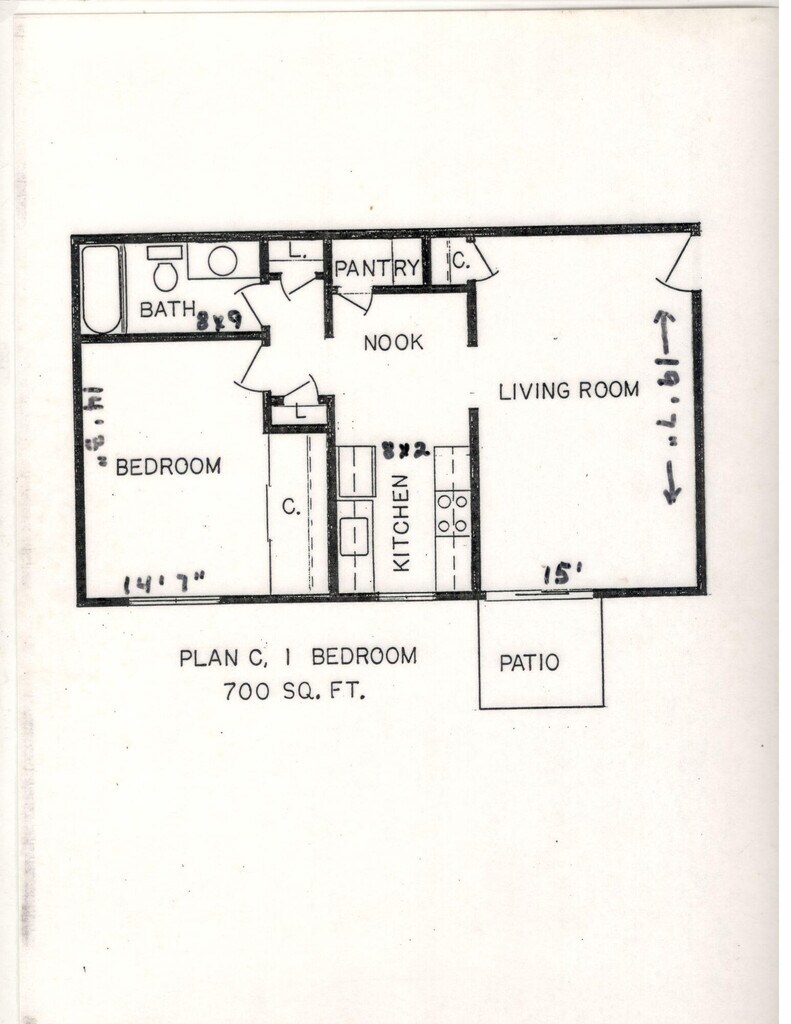 1x1 A - Plano 2 Unidad de apartamento: 021Modelo de apartamento: 1x1 A$1,3751 Dormitorio, 1 Baño, 627 sq ftDisponible Ahora1x1 C