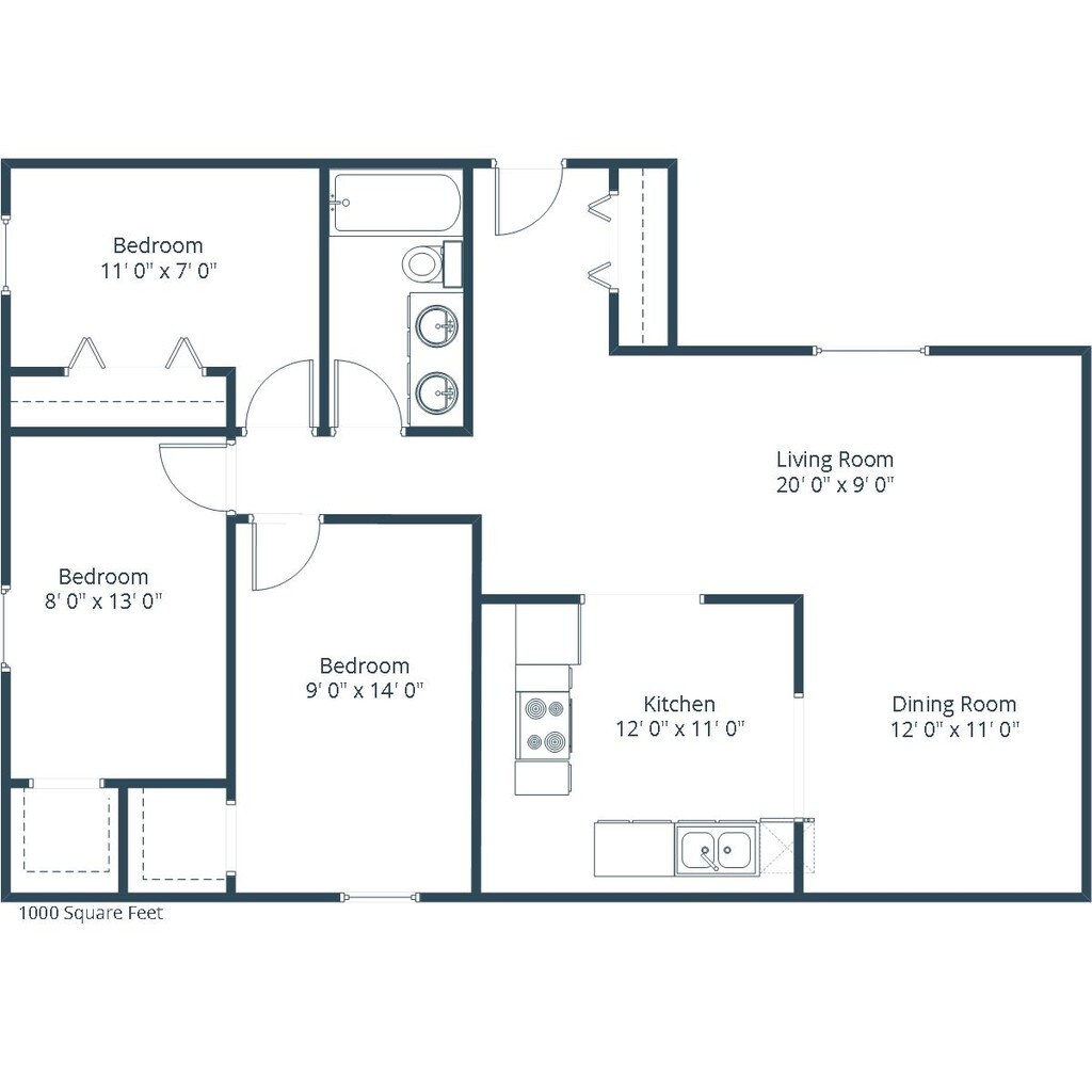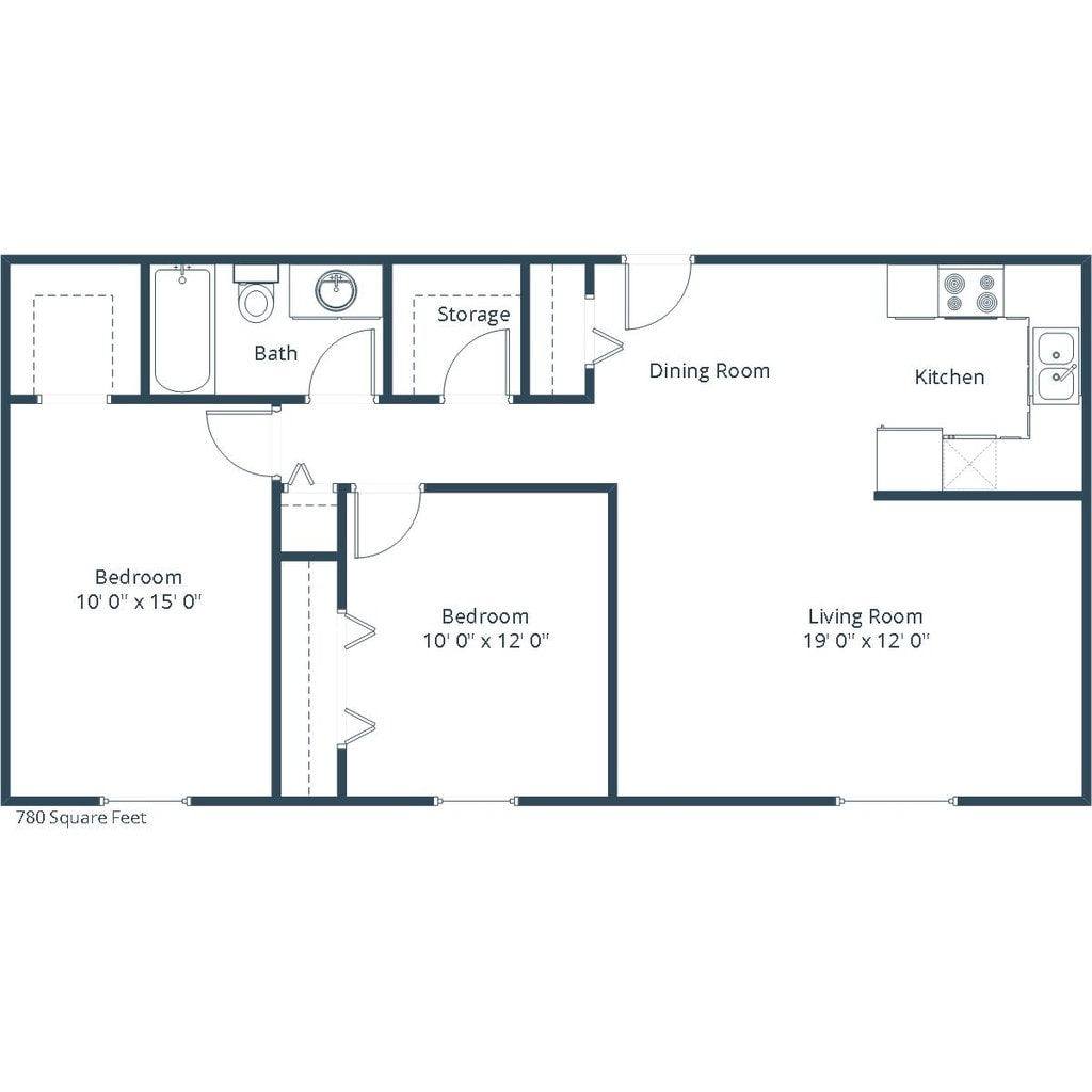 2 Dormitorios, 1 Baño, 780 pies²Galería del Modelo