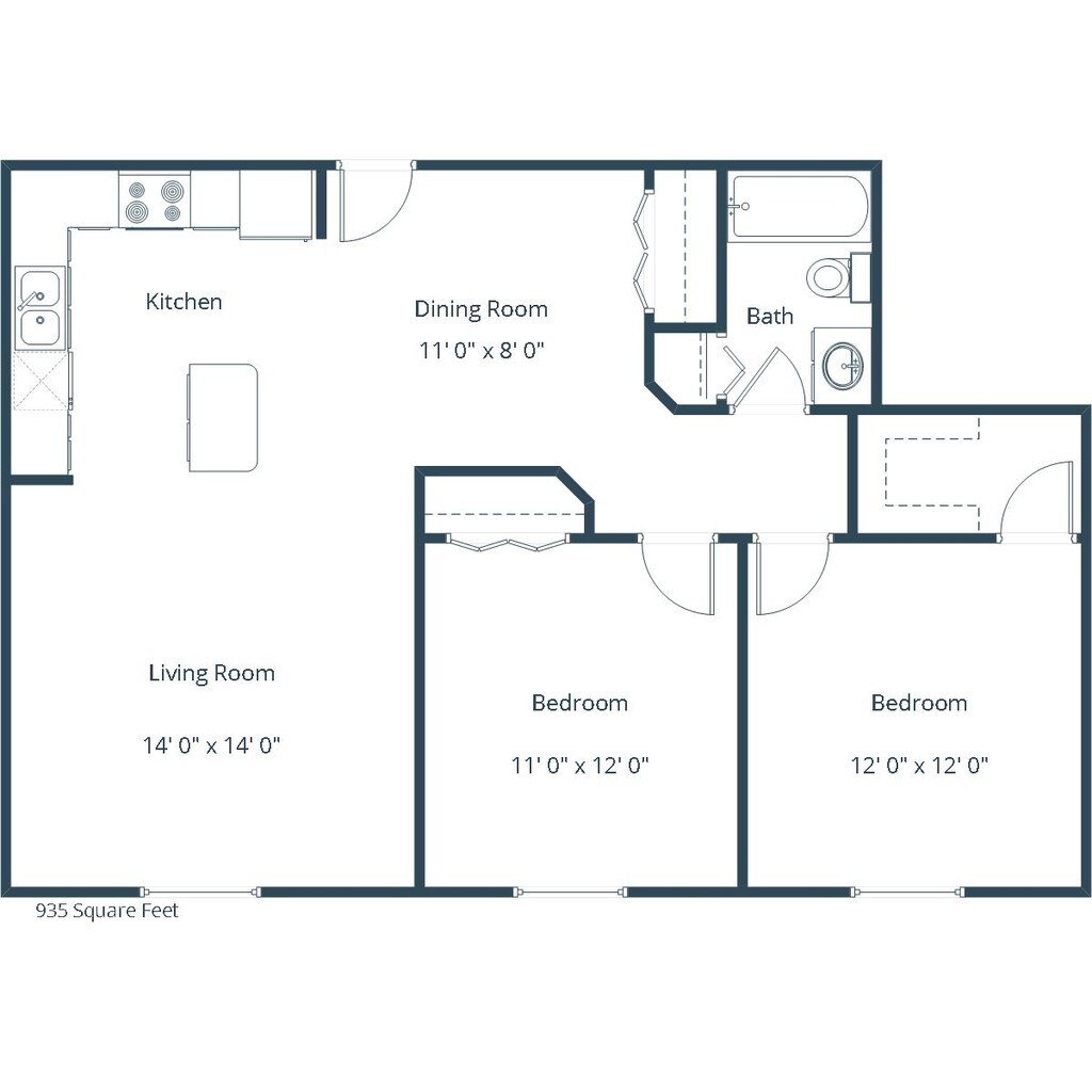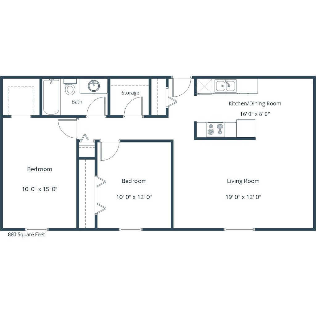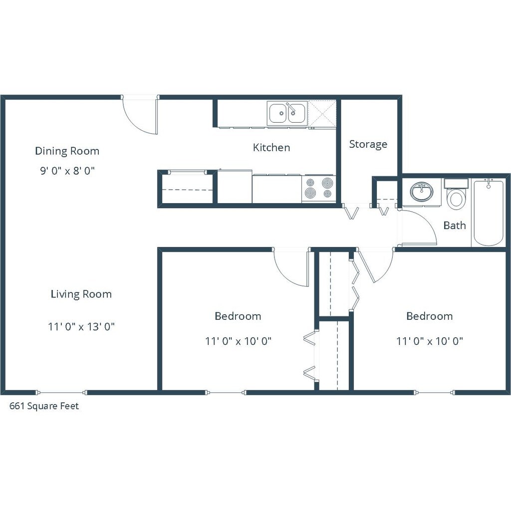 2 Dormitorios, 1 Baño, 661 pies²Galería del Modelo