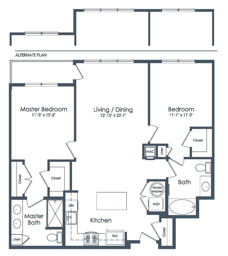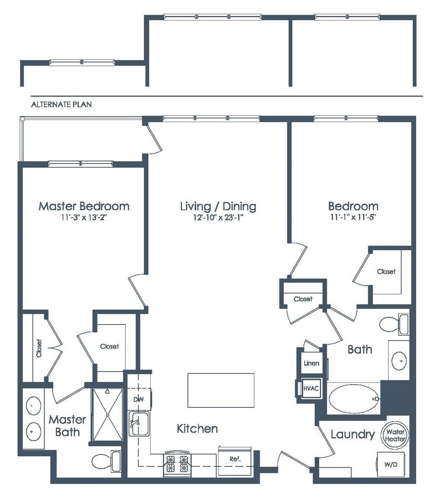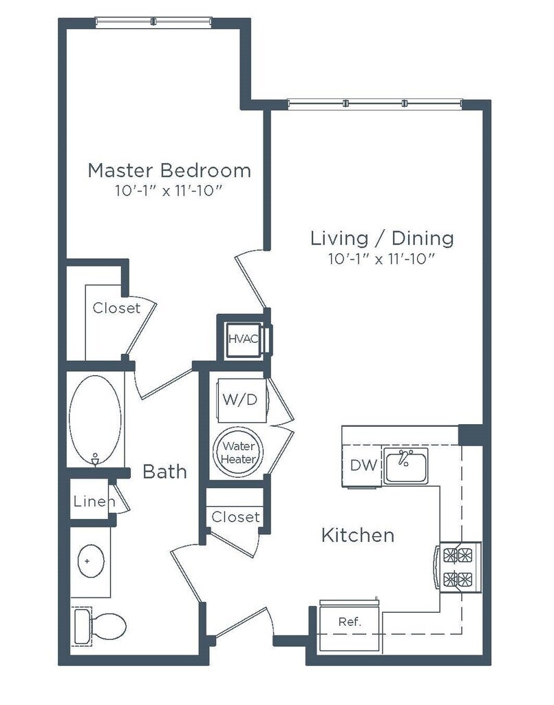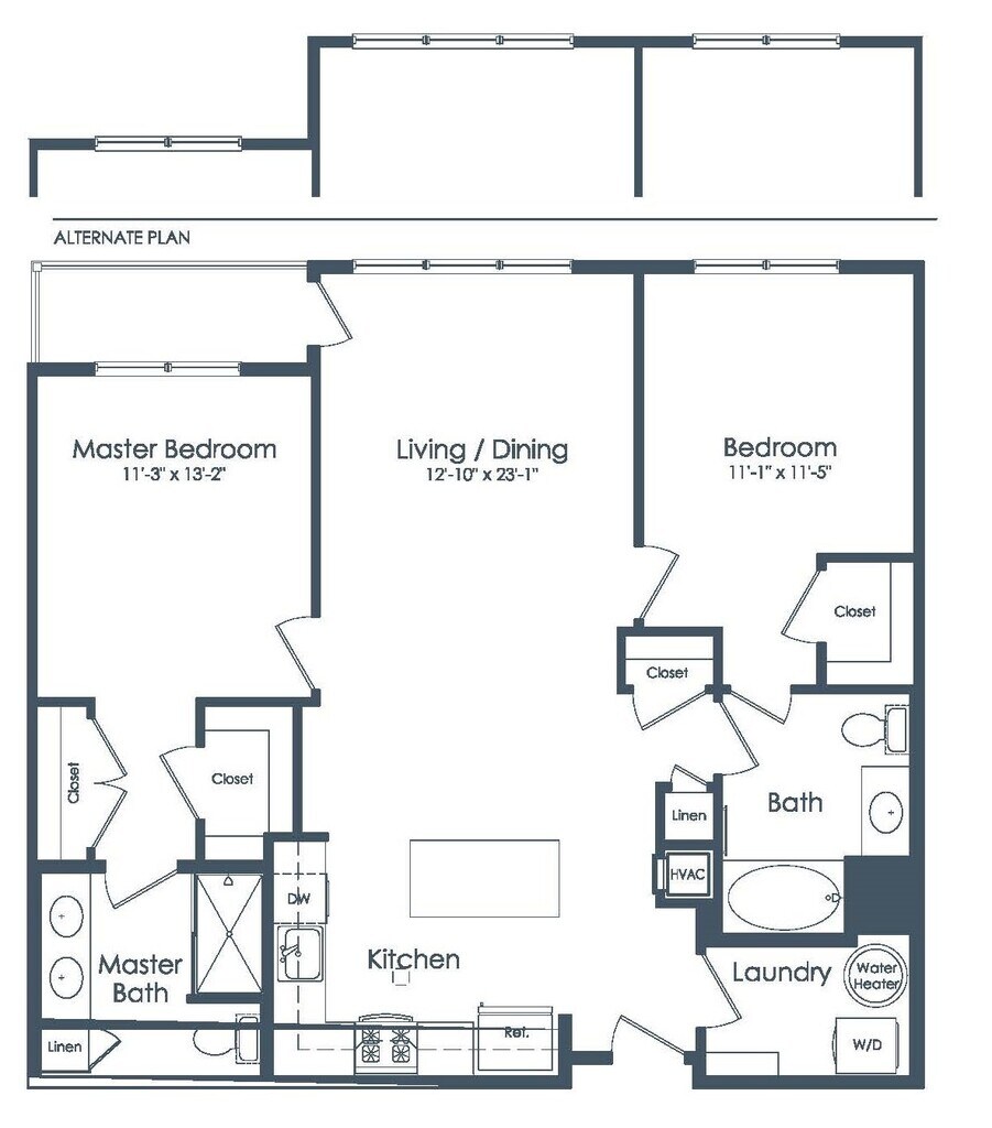 Modelo de apartamento: A1Llame para Precios1 Dormitorio, 1 Baño, 670 sq ftNo Disponible![]()