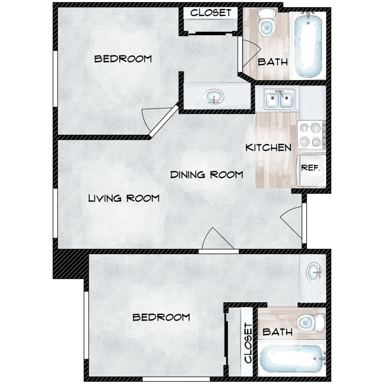 2 Dormitorios, 2 Baños, 800 pies²Disponible AhoraGalería del Modelo