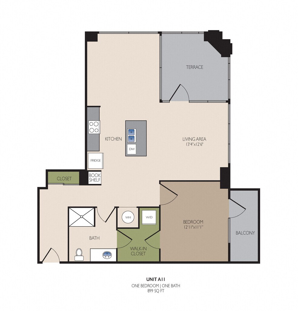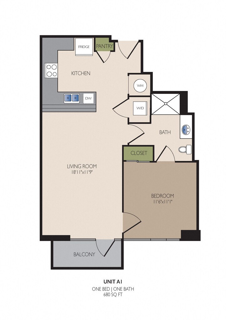 Modelo de apartamento: A11 Dormitorio, 1 Baño, 680 sq ftDisponible Ahora![]()