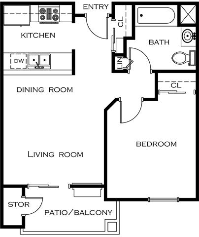 Modelo de apartamento: Plan A1 Dormitorio, 1 Baño, 550 sq ftNo Disponible![]()