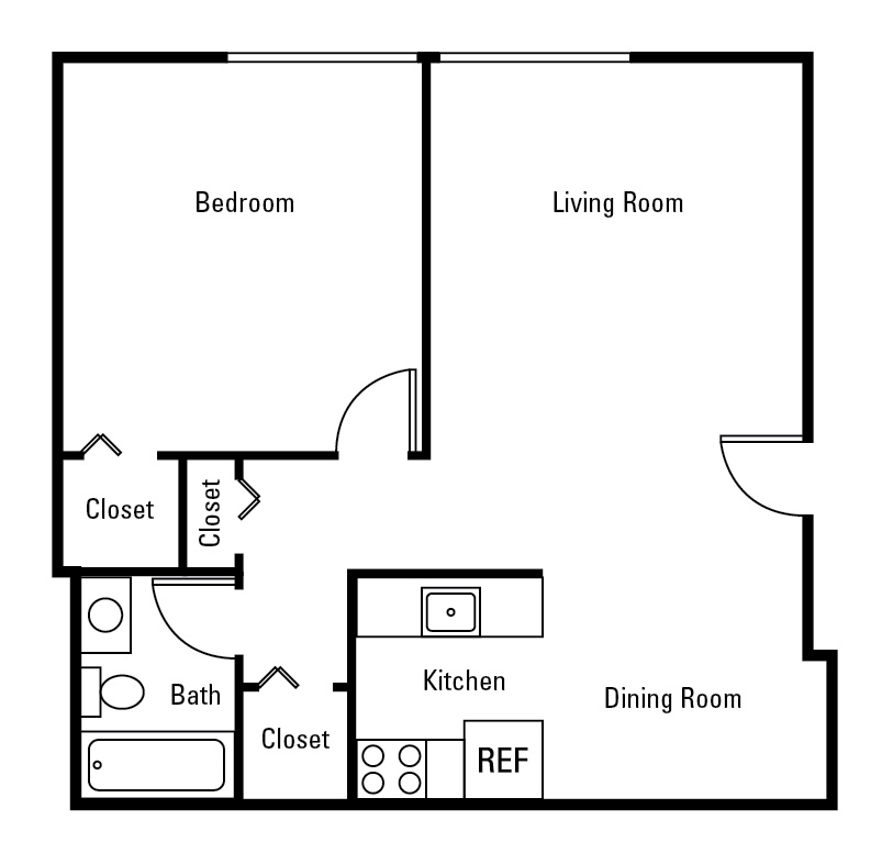 Modelo de apartamento: One Bedroom 585 sqftLlame para Precios1 Dormitorio, 1 Baño, 561 sq ftNo DisponibleOne Bedroom 585 sqft - Plano 1 2 Dormitorios