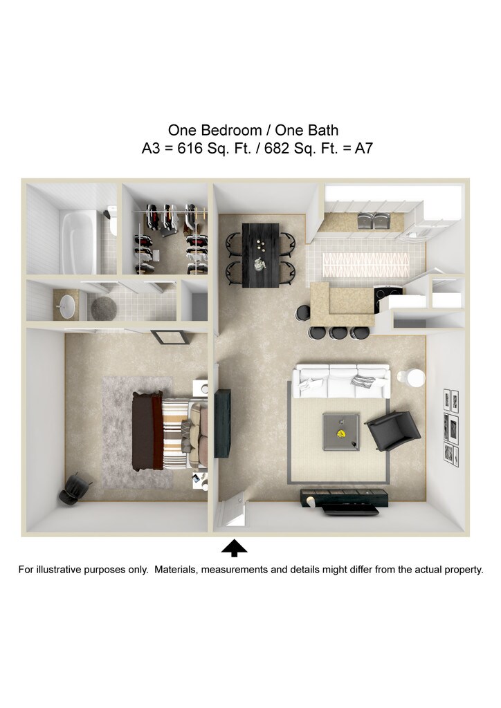 Modelo de apartamento: A1Desde $7441 Dormitorio, 1 Baño, 560 sq ftDisponible AhoraLos planos de la planta son una interpretación artística. Todas las dimensiones son aproximadas. Los tamaños o el detalle del producto real y sus especificaciones pueden variar. No todas las características están disponibles en todos los hogares para rentar. Los precios y la disponibilidad están sujetos a cambios. El alquiler que se muestra es mensual. Se pueden aplicar ciertos cargos, por ejemplo, entrega de paquetes, recolección de basura, agua, servicios, etc. Depositos varian. Consulta a un representante para conocer detalles.