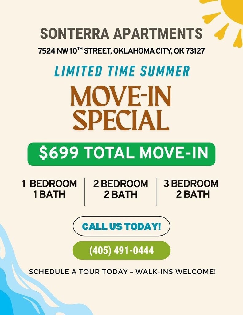 La promoción que hay actualmente para la renta en Sonterra Apartments (OK) es: $699 move in special 50% off first month rent!~~$699 move in special 50% off first month rent! This special offer includes rent and deposit, making it easier than ever to move into your new home. Apply now and lock in this incredible deal before it's gone! Call for more details.