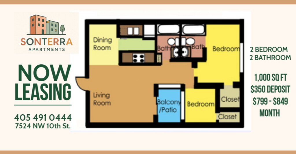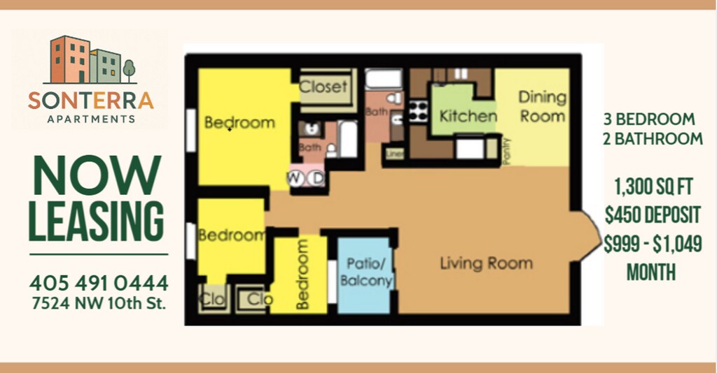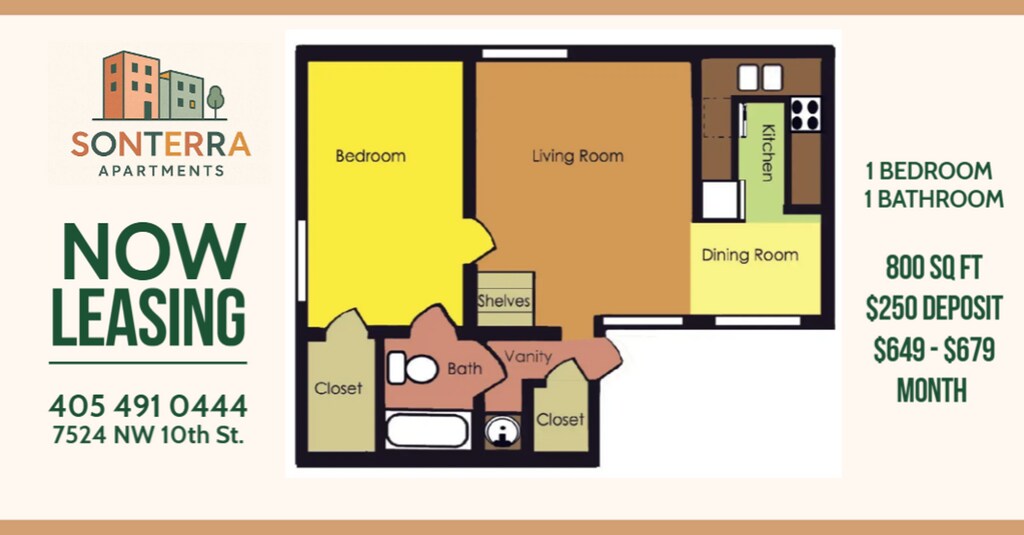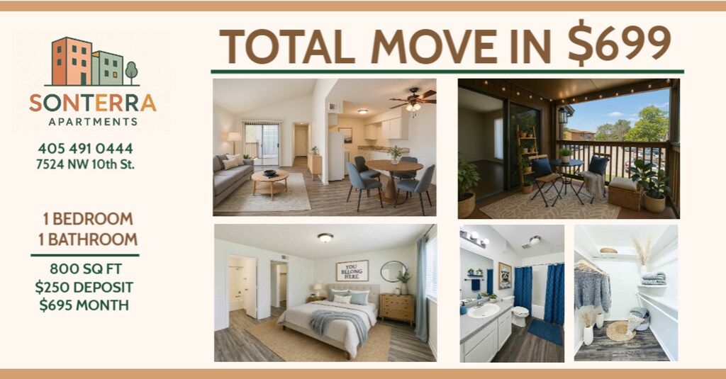 Sonterra Apartments (OK) ofrece apartamentos de 1 a 3 Dormitorios desde $695 con 800–1,300 pies cuadrados. Aquí está el precio actual y la disponibilidad: