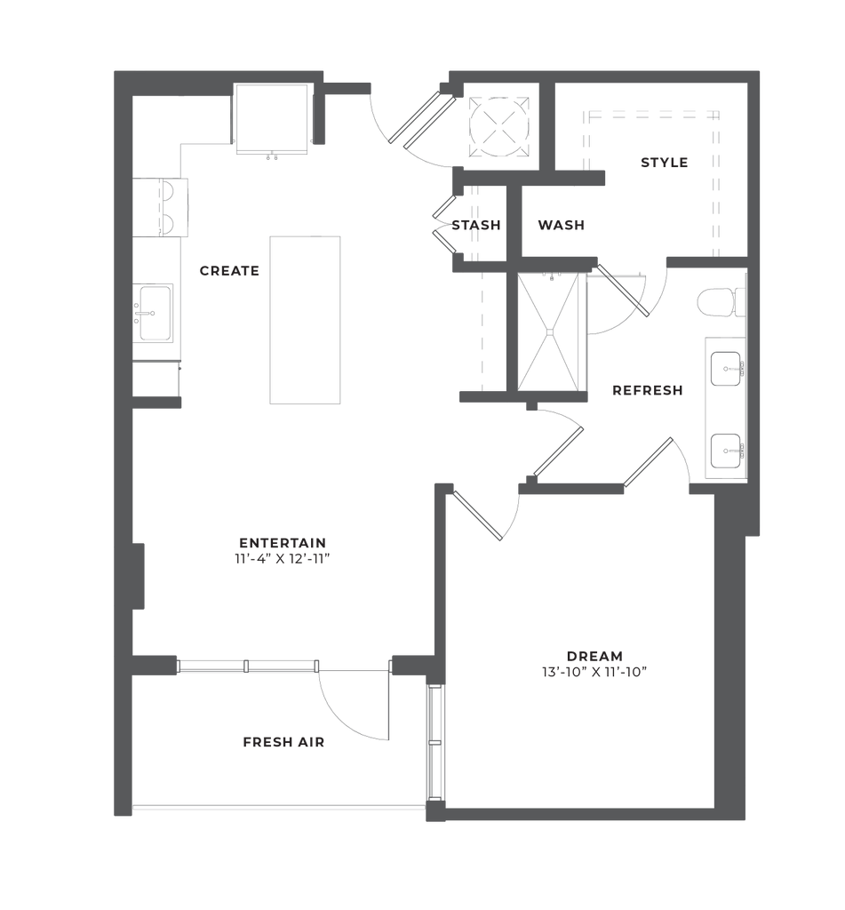 1 Dormitorio, 1 Baño, 829 pies²Disponible AhoraGalería del Modelo