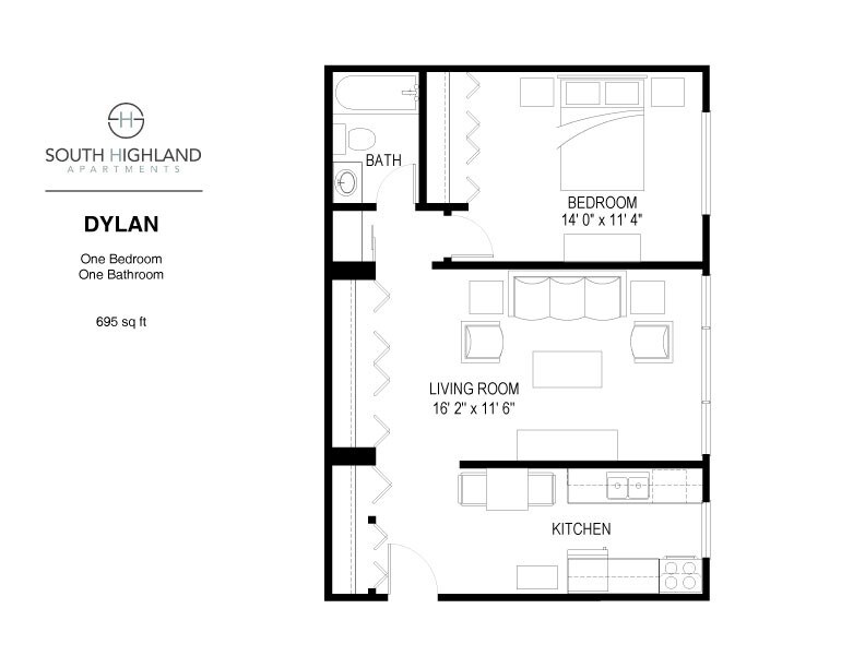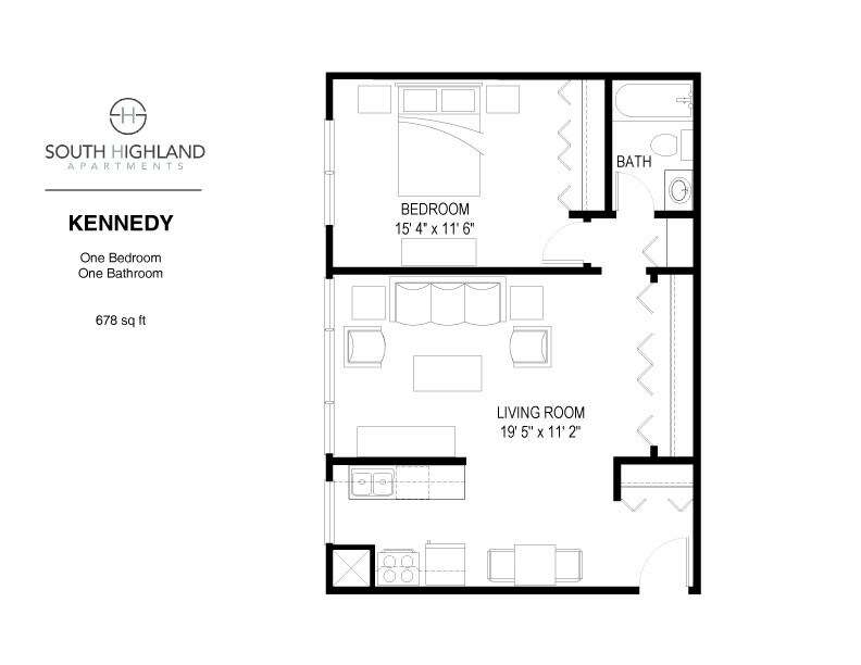 Modelo de apartamento: Kennedy1 Dormitorio, 1 Baño, 678 sq ftNo DisponibleKennedy - Plano 1 Dylan