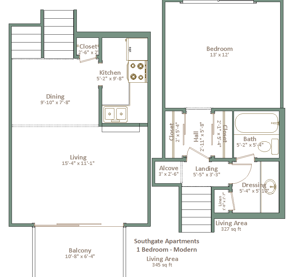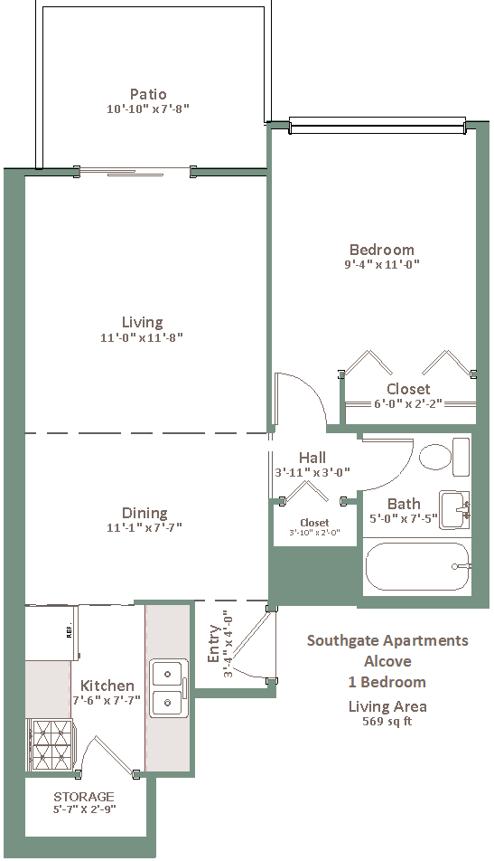 Modelo de apartamento: AlcoveDesde $9951 Dormitorio, 1 Baño, 569-895 sq ftDisponible Ahora![]()