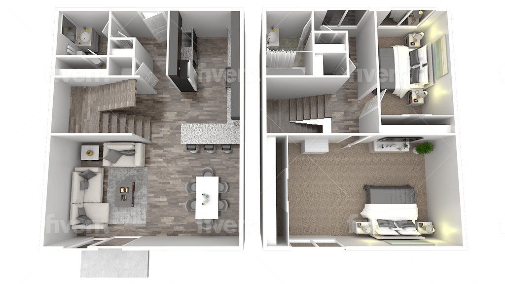 Amplios dúplex de 2 habitaciones con cocina renovada y baño. Enormes apartamentos de estilo loft con acceso en la azotea, espacio de estar de tamaño adecuado y más pequeños habitación en planta baja.