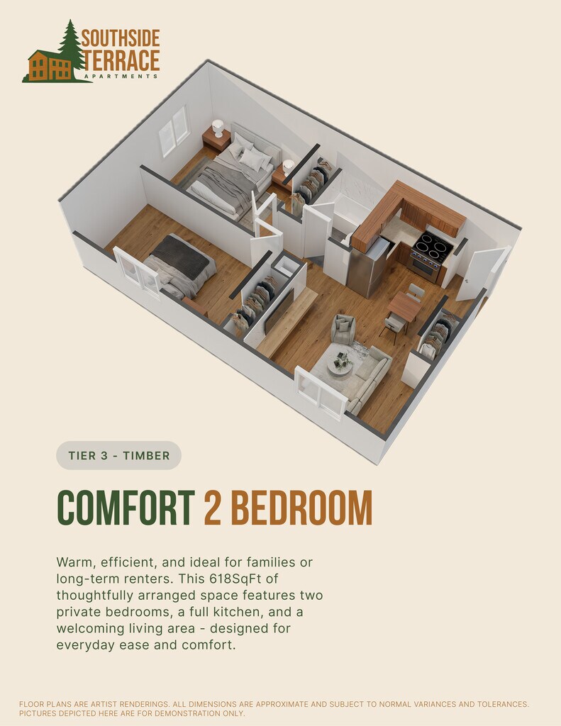 Modelo de apartamento: Comfort Two Bedroom$1,9502 Dormitorios, 1 Baño, 618 sq ftDisponible AhoraComfort Two Bedroom - Plano 1