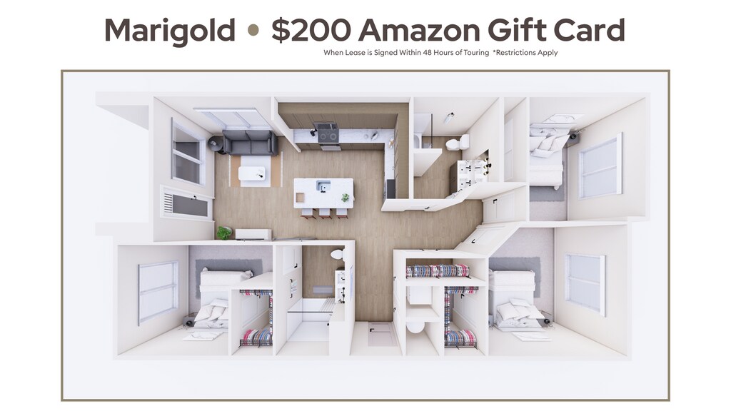 Modelo de apartamento: CloverDesde $1,4251 Dormitorio, 1 Baño, 658 sq ftDisponible August 7, 2026PlanosFotos![]()