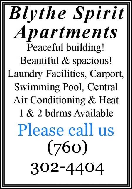 Nos complace darte la bienvenida al hermoso complejo Blythe, California. The Blythe Spirit Apartments está ubicado cerca de supermercados, farmacias, restaurantes y servicios. Ubicado en Riverside County, Blythe es un área agricultural a lo largo del río Colorado. Está ubicado a aproximadamente a 224 millas de los Ángeles y 150 millas al oeste de Phoenix. Tenemos disponibilidad para mudanzas inmediatas. Tenemos apartamentos estudios de 1 habitación y 2 habitaciones listos para ti. Llámanos.