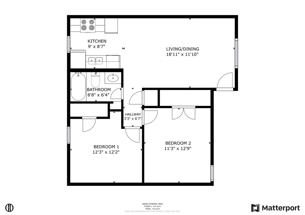 2 Dormitorios, 1 Baño, 714 pies²Galería del Modelo