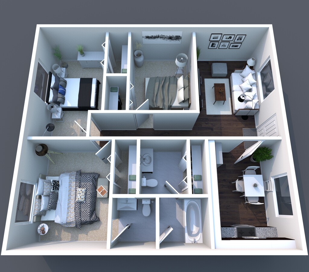 Modelo de apartamento: 3 BD/1.5 BA$1,3463 Dormitorios, 1.5 Baños, 1080 sq ftDisponible Ahora![]()