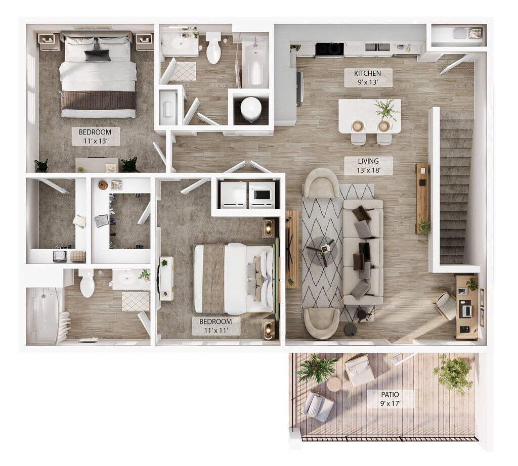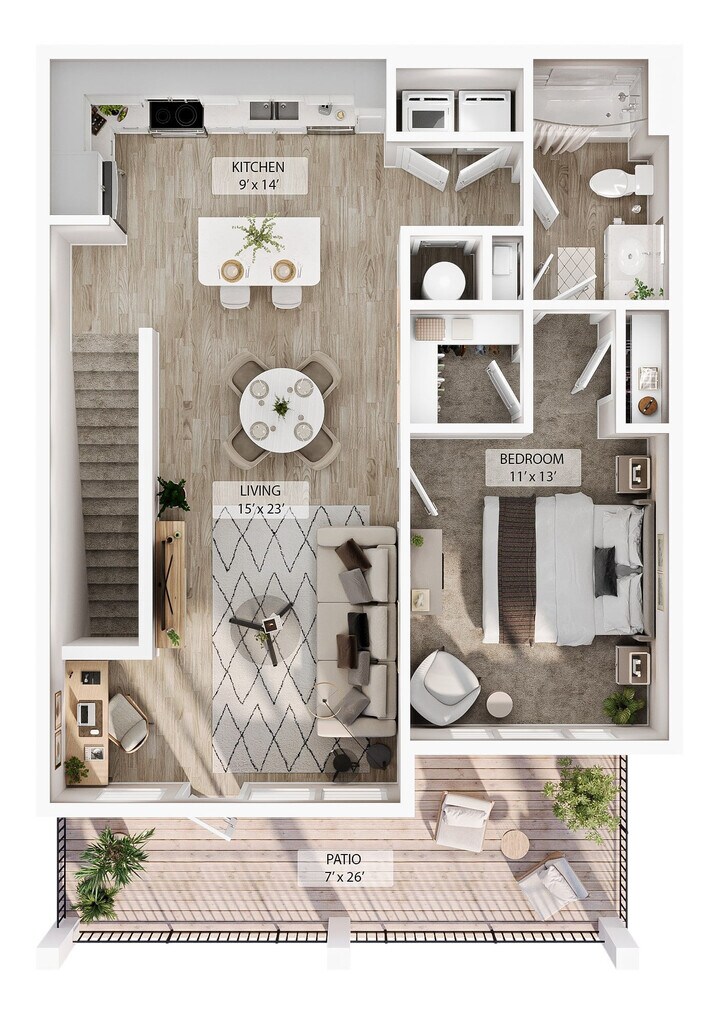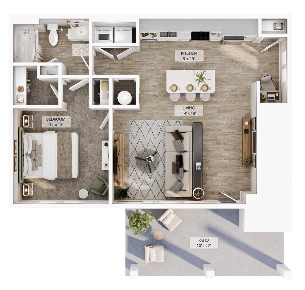 Modelo de apartamento: 1 BR Designer CourtyardDesde $1,5441 Dormitorio, 1 Baño, 779 sq ftDisponible AhoraLos planos son representaciones artísticas. Todas las dimensiones son aproximadas. El producto y las especificaciones reales pueden variar en tamaño o detalle. No todas las características están disponibles en cada vivienda en alquiler. Por favor, consulta con un representante para obtener más detalles.