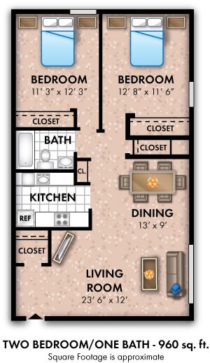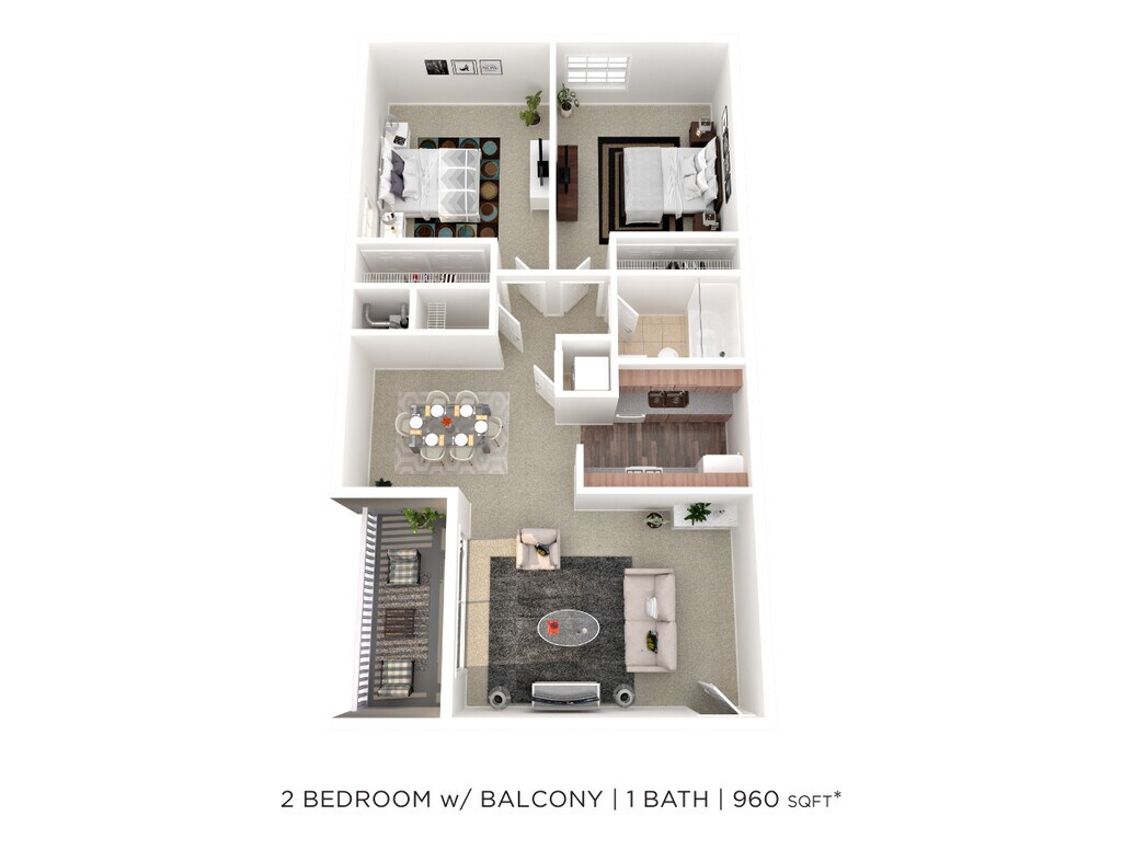 2 Dormitorios, 1 Baño, 960 pies²Disponible AhoraGalería del Modelo