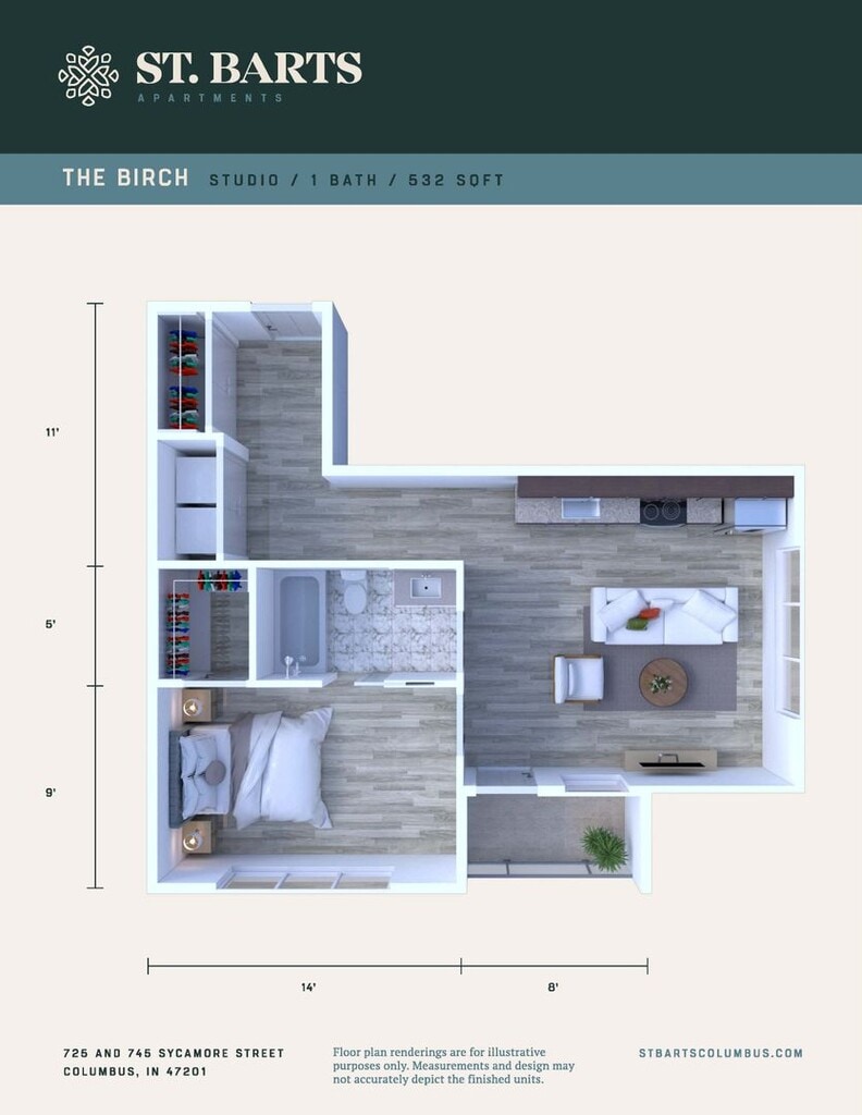 The Birch - Imagen 1 Unidad de apartamento: 104NModelo de apartamento: The Birch$9991 Dormitorio, 1 Baño, 532 sq ftDisponible AhoraThe Spruce