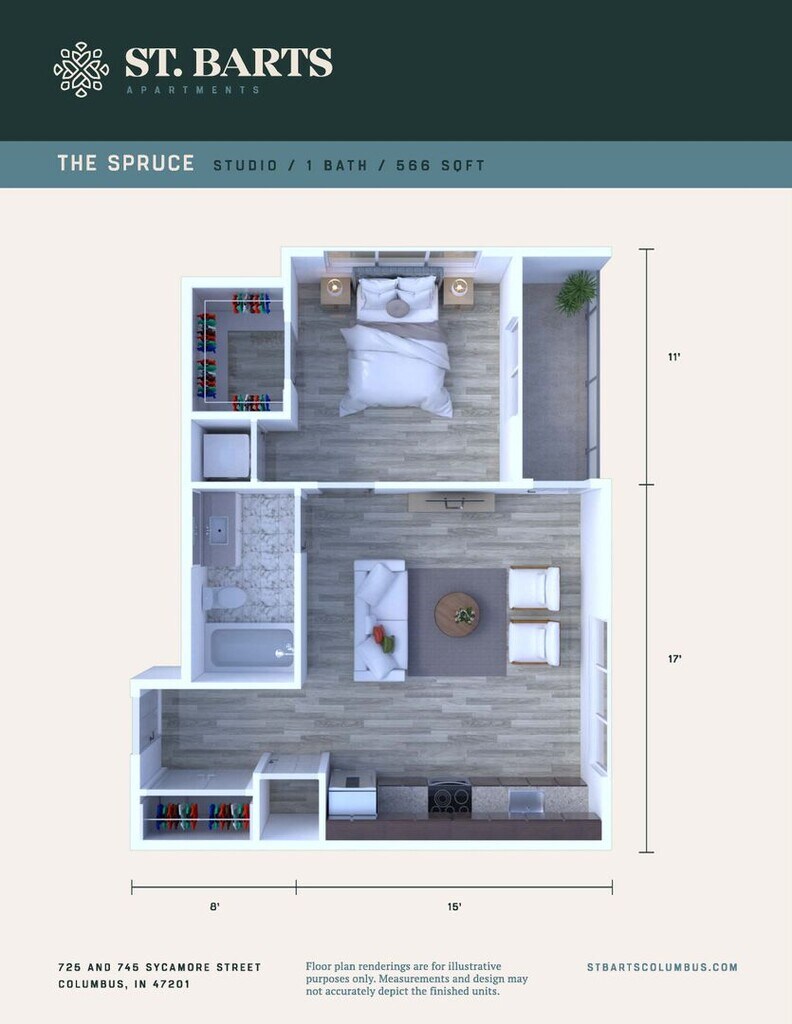 Modelo de apartamento: The Spruce$1,1751 Dormitorio, 1 Baño, 566 sq ftDisponible AhoraPlanosFotos![]()