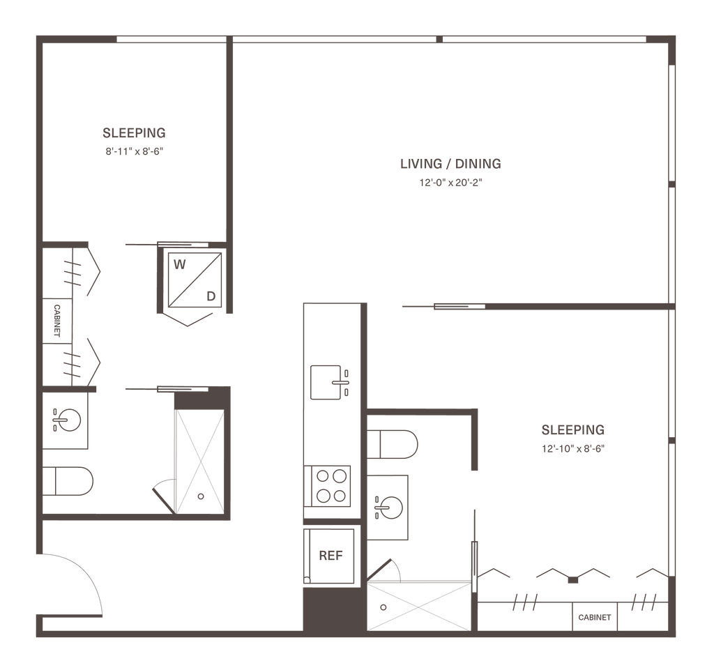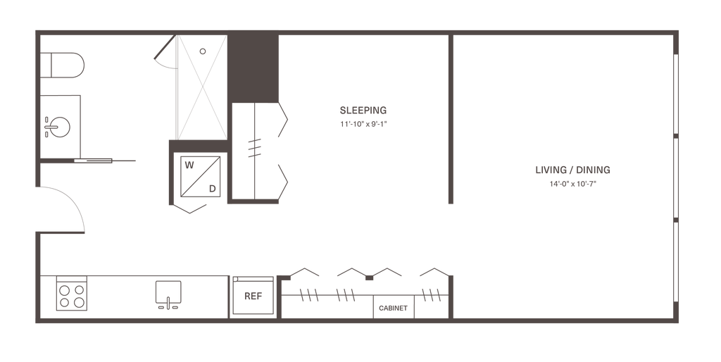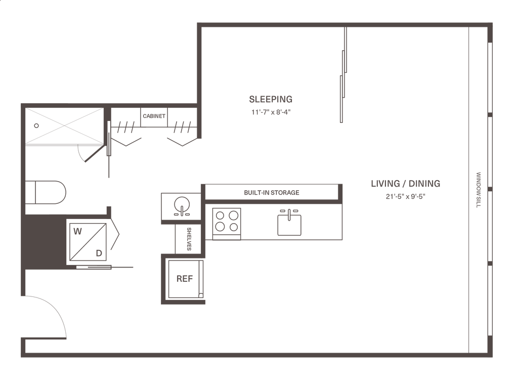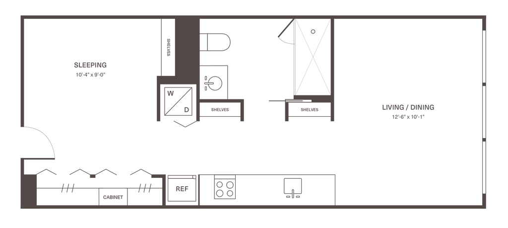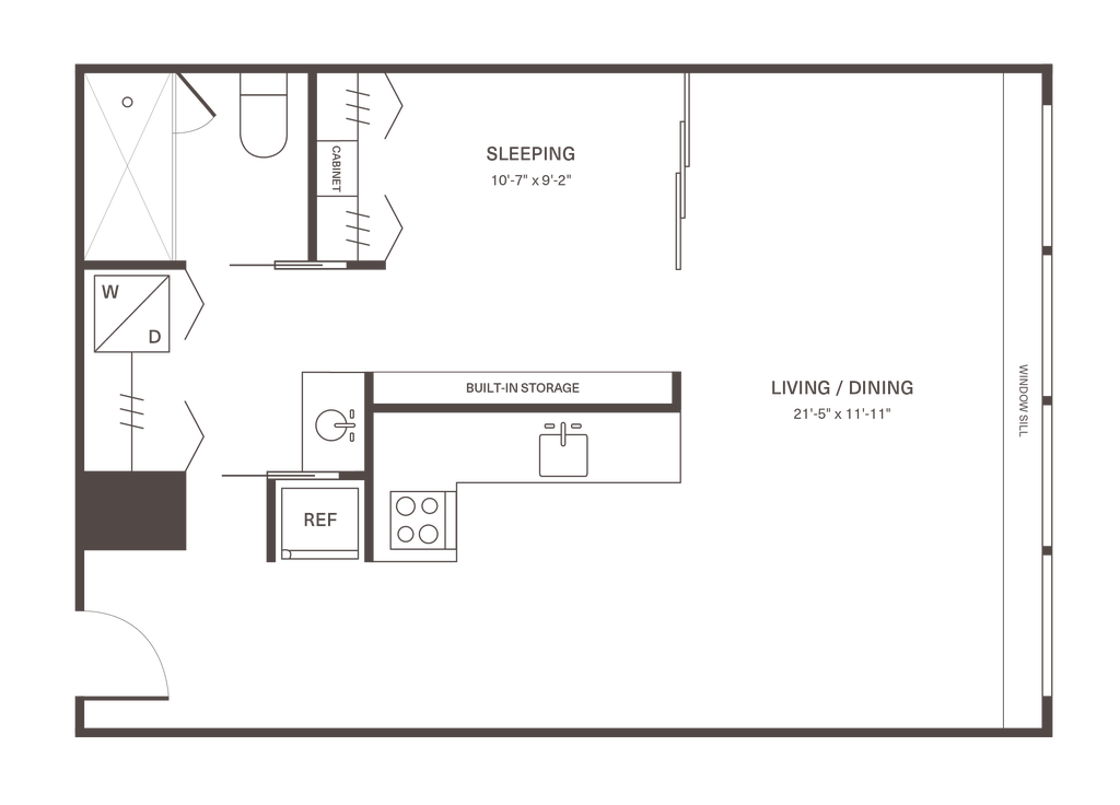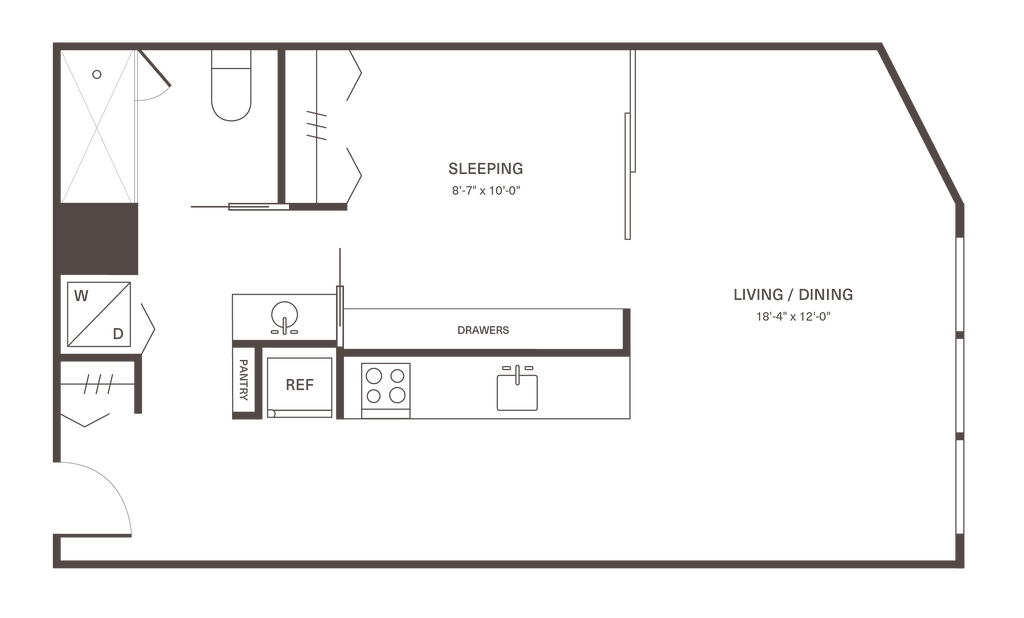 S3 - Plano 1 Unidad de apartamento: 1-5026Modelo de apartamento: S3Desde $2,435Estudio, 1 Baño, 439 sq ftDisponible February 24, 2026Plano: S2