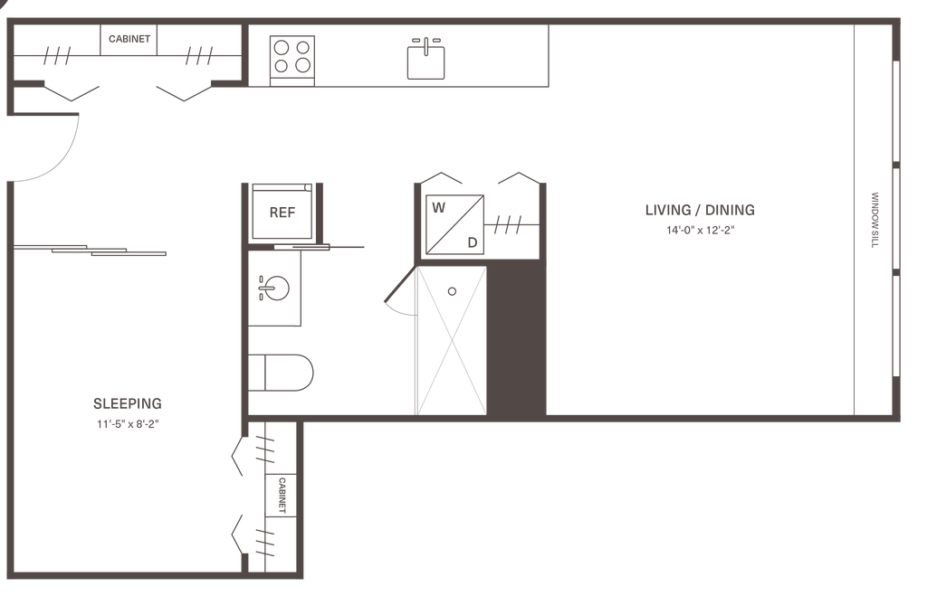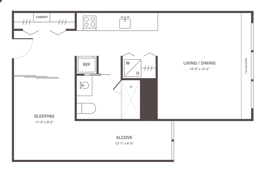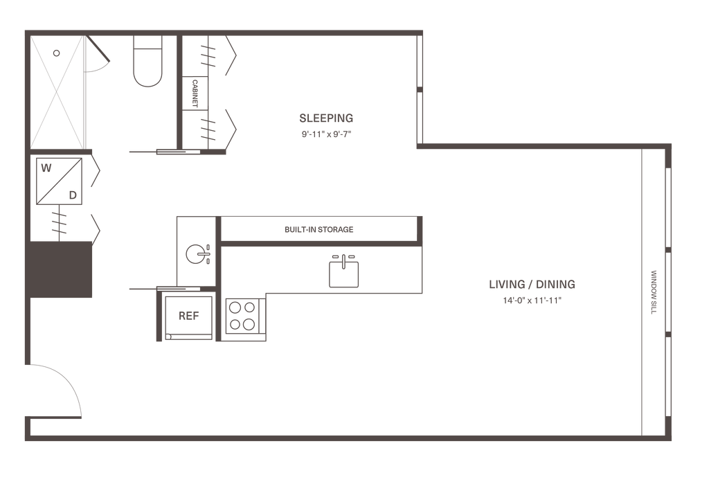 Precio Fecha Disponibilidad Unidad Pies² Depósito $2,405 April 24, 2026 1-1109 439 $750 Detalles y características de la Unidad 1-1109