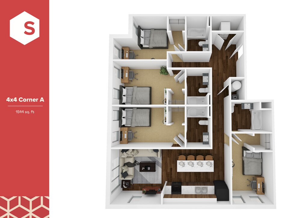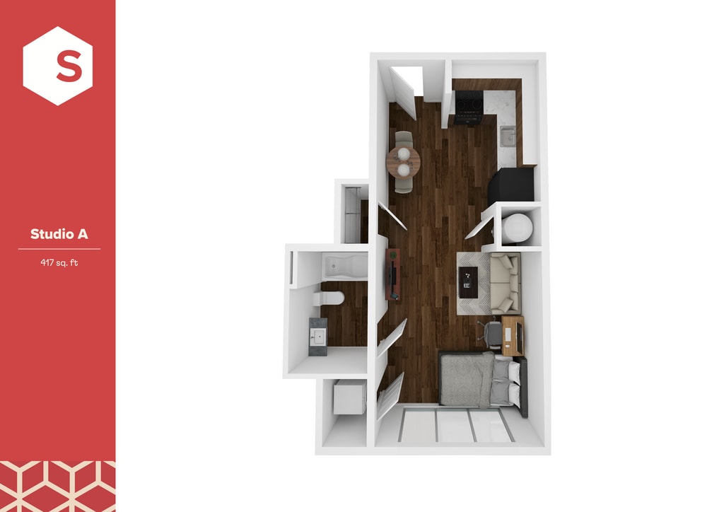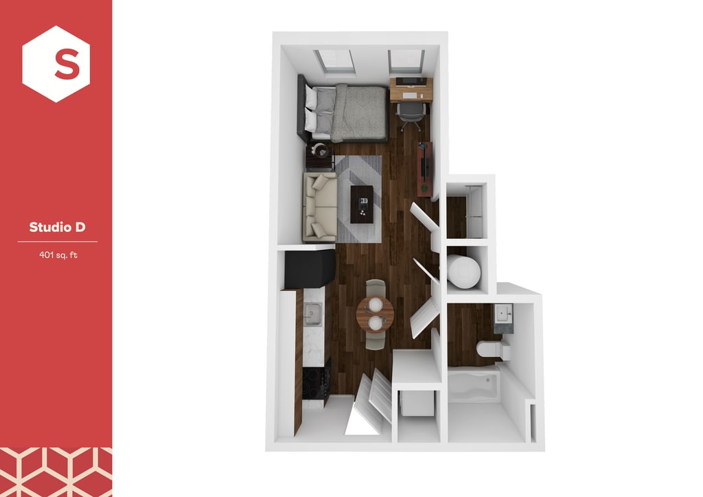 Studio - Plano 4 Unidad de apartamento: PrivateModelo de apartamento: Studio$1,675Estudio, 1 Baño, 394-432 sq ftDisponible August 13, 2026Studio +