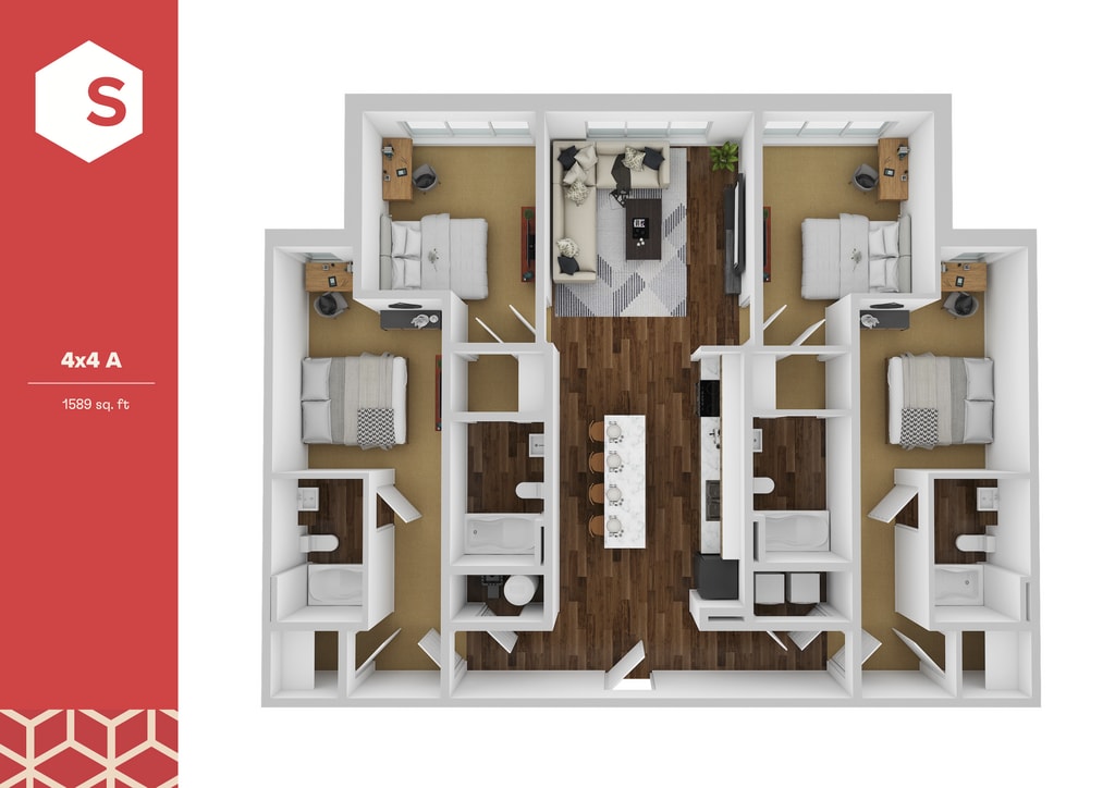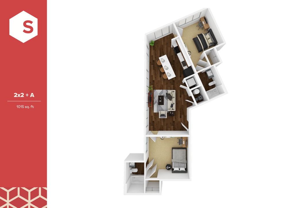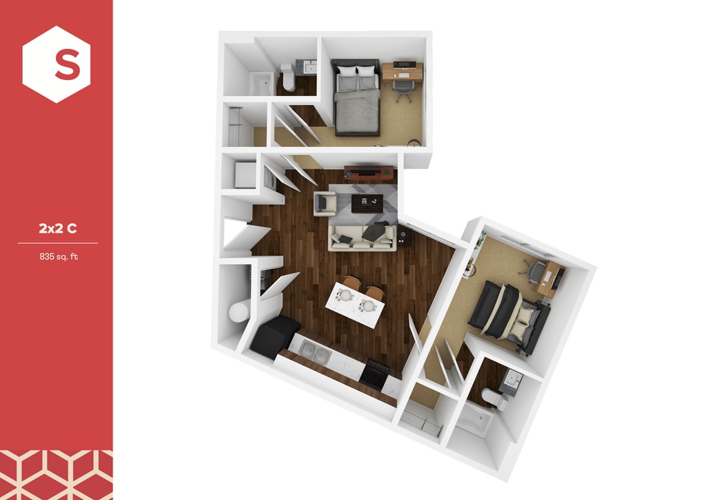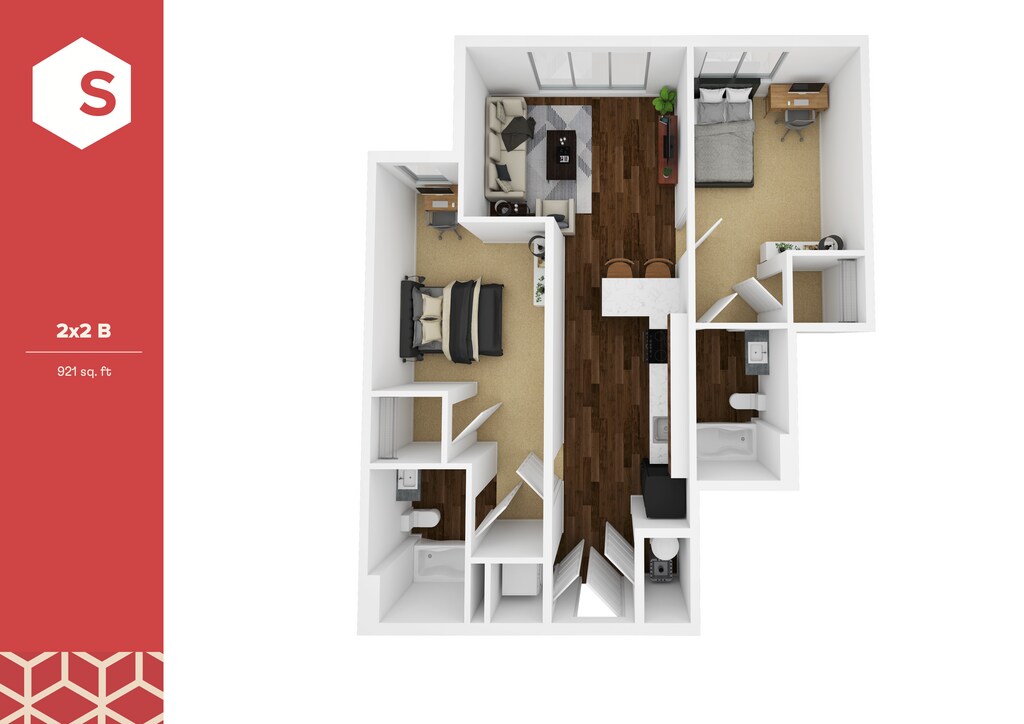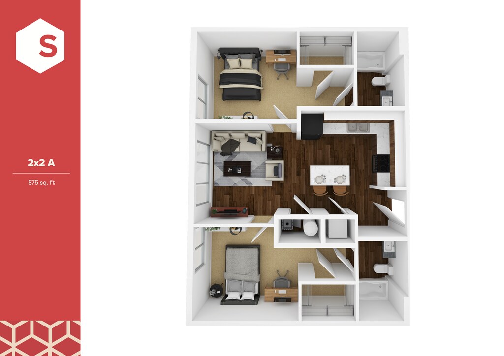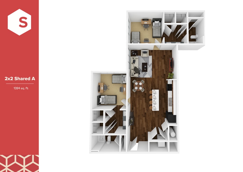 Modelo de apartamento: 2x2 SharedDesde $8452 Dormitorios, 2 Baños, 1394 sq ftDisponible AhoraLos planos son representaciones artísticas. Todas las dimensiones son aproximadas. El producto y las especificaciones reales pueden variar en tamaño o detalle. No todas las características están disponibles en cada vivienda en alquiler. Por favor, consulta con un representante para obtener más detalles.