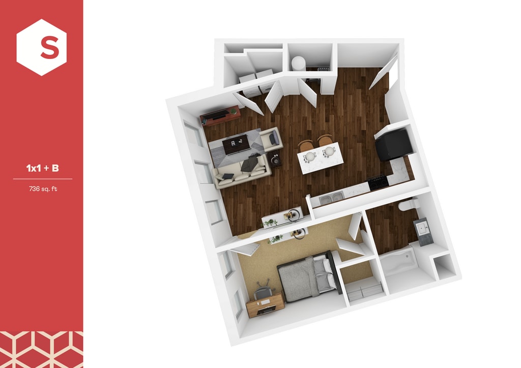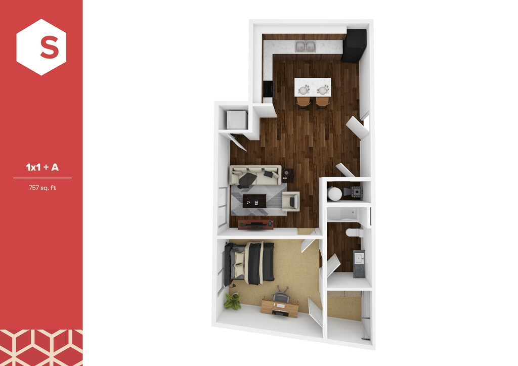 1x1 + - Plano 2 Unidad de apartamento: PrivateModelo de apartamento: 1x1 +$1,9991 Dormitorio, 1 Baño, 736-757 sq ftDisponible August 13, 20262 Dormitorios