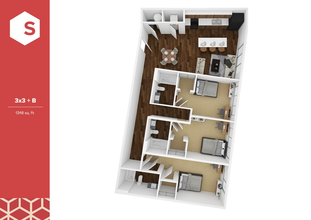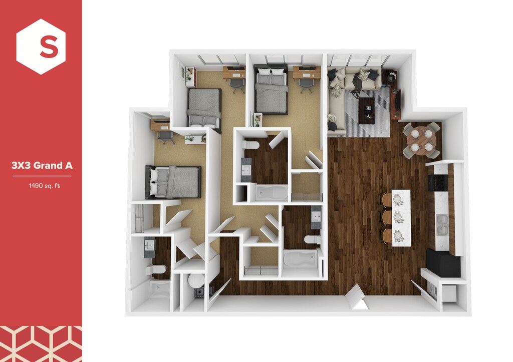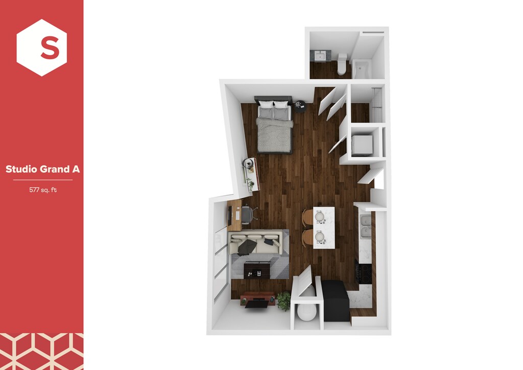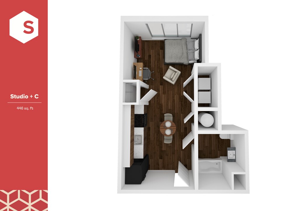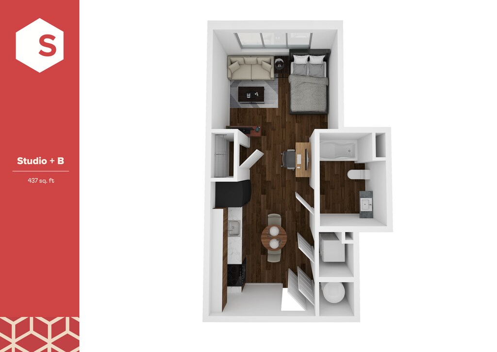 Studio + - Plano 3 Unidad de apartamento: PrivateModelo de apartamento: Studio +$1,695Estudio, 1 Baño, 424-446 sq ftDisponible August 13, 2026Studio Grand