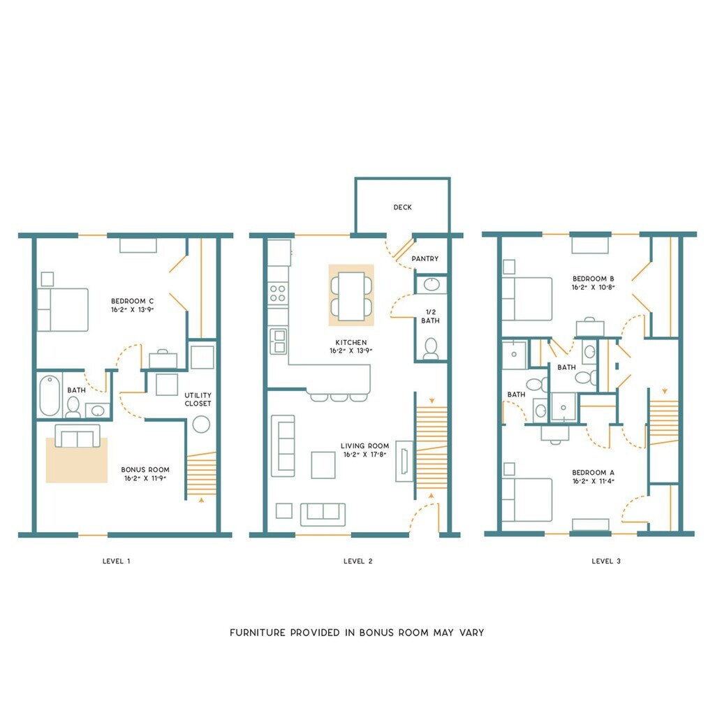 Modelo de apartamento: 3BR/3.5BR - Unfurnished - B3 Dormitorios, 3.5 Baños, 1700 sq ftDisponible Ahora![]()