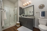 - Los lujosos acabados del baño incluyen puertas de ducha de vidrio sin marco y espejos con marco de madera