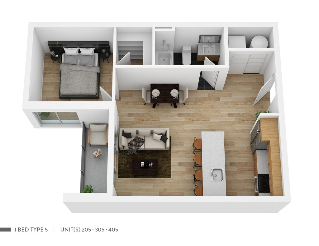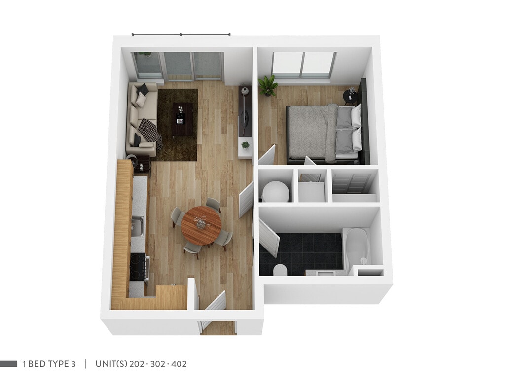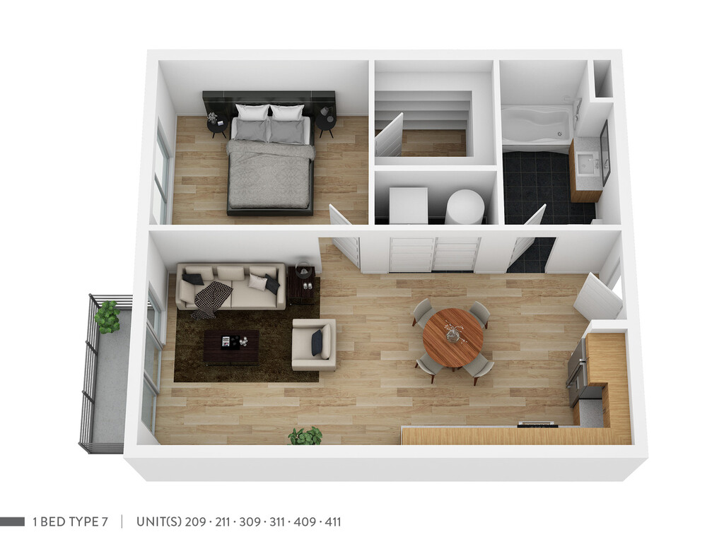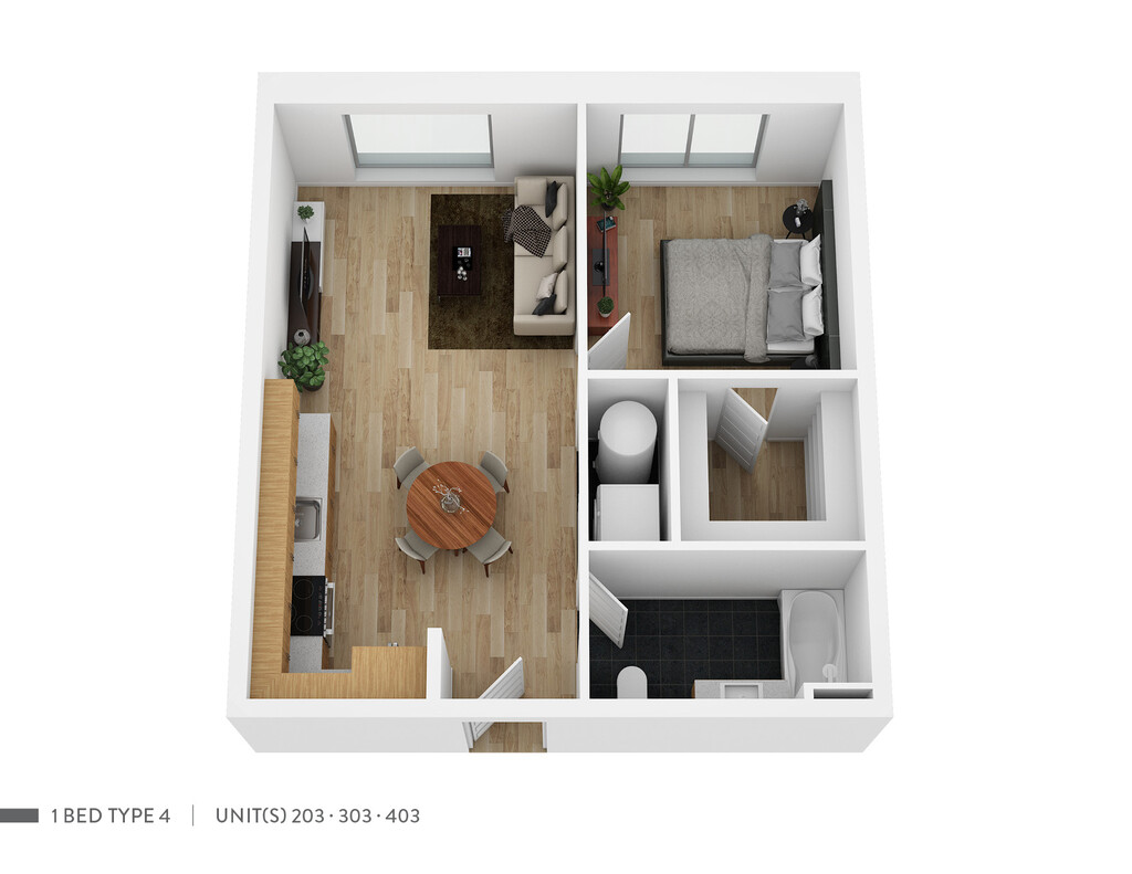 1 Dormitorio, 1 Baño, 626-636 pies²Disponible AhoraGalería del Modelo