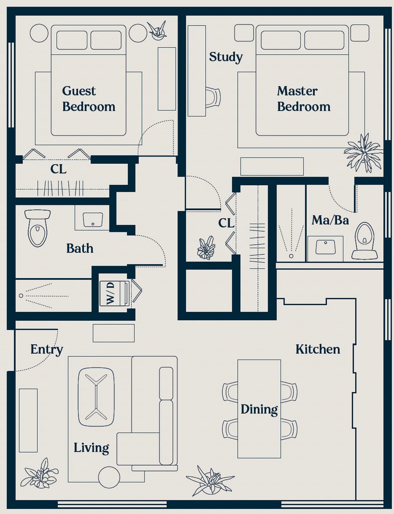 Unidad de apartamento: Unit 05Modelo de apartamento: 1x1$3,9501 Dormitorio, 1 Baño, 850 sq ftDisponible January 1, 20262 Dormitorios