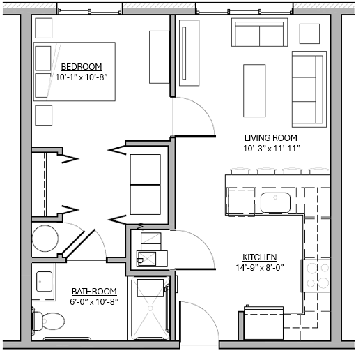 Modelo de apartamento: 101Desde $1,4001 Dormitorio, 1 Baño, 575 sq ftDisponible AhoraPlanosFotos![]()