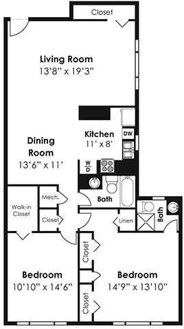 Modelo de apartamento: 2 Bedroom 1 BathLlame para Precios2 Dormitorios, 1 Baño, 980 sq ftNo Disponible![]()