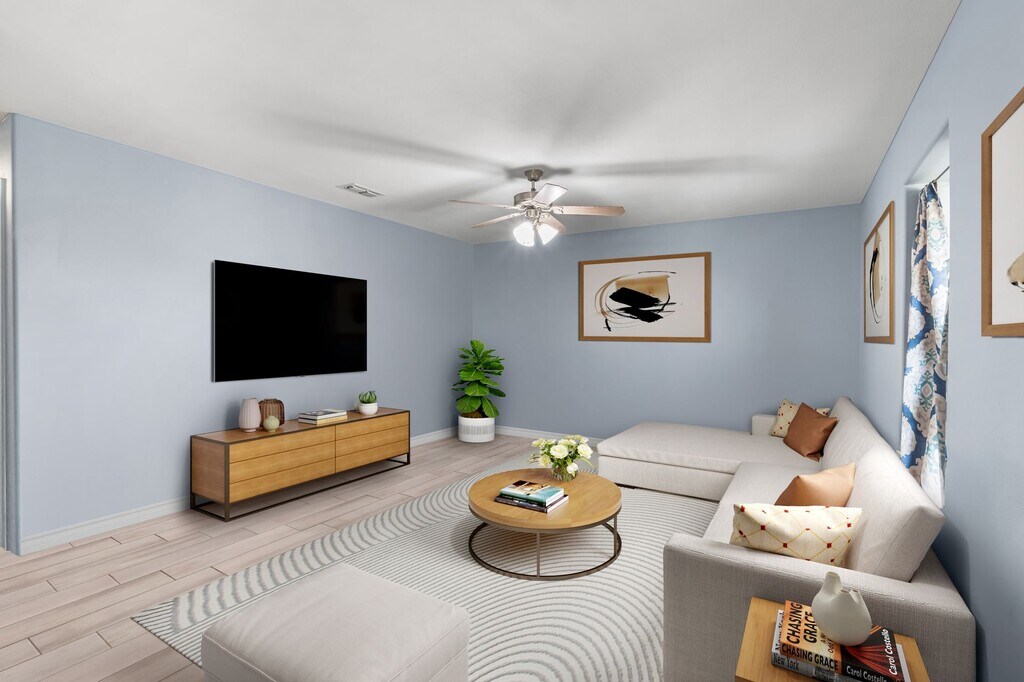Modern unit with central A/C, cable ready setup, tile floors, ceiling fans, pet-friendly policy, water and trash included, plus reserved parking available.