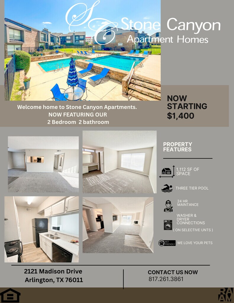 Stone Canyon ofrece apartamentos de 1 a 2 Dormitorios desde $1,015 con 690–1,112 pies cuadrados. Aquí está el precio actual y la disponibilidad: