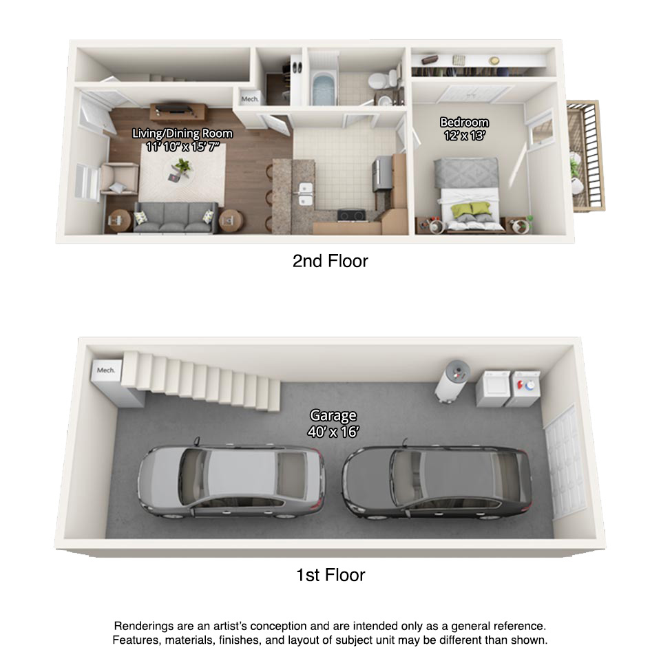 Modelo de apartamento: 1 Bedroom Townhome with Drive Under Garage1 Dormitorio, 1 Baño, 640 sq ftNo Disponible1 Bedroom Townhome with Drive Under Garage - Plano 1 2 Dormitorios