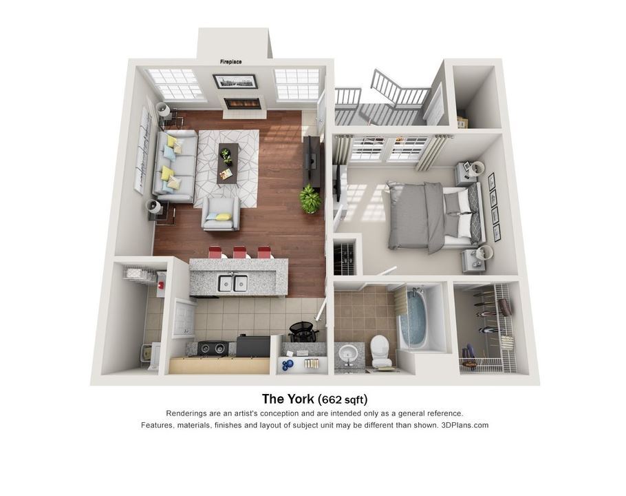 York w/Garage - Plano 1 Unidad de apartamento: B1925Modelo de apartamento: York w/Garage1 Dormitorio, 1 Baño, 662 sq ftDisponible AhoraYork