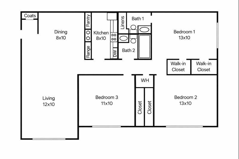 Modelo de apartamento: 3 Bed, 2 Bath3 Dormitorios, 3 Baños, 958 sq ftDisponible Ahora![]()