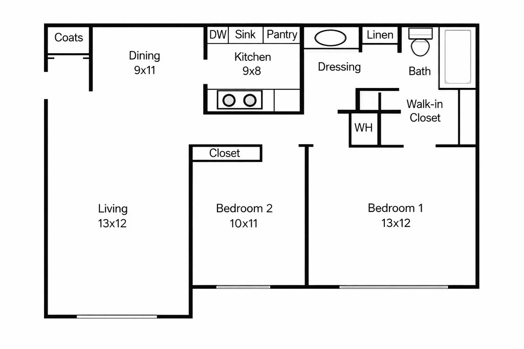 2 Dormitorios, 1 Baño, 858-958 pies²Disponible AhoraGalería del Modelo