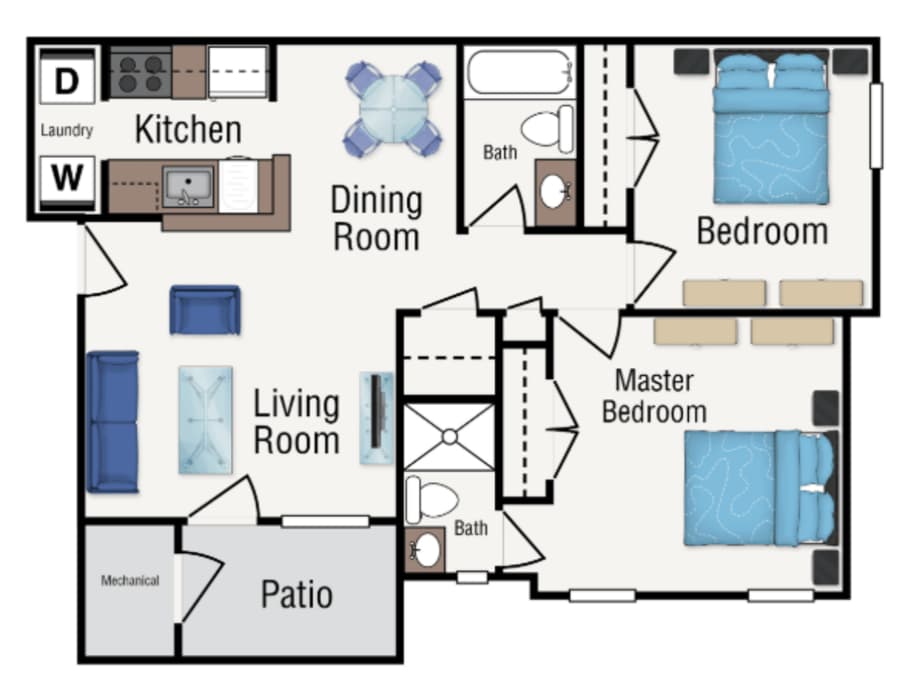 Modelo de apartamento: Two BedroomLlame para Precios2 Dormitorios, 2 Baños, 975 sq ftNo DisponiblePlanosFotos![]()