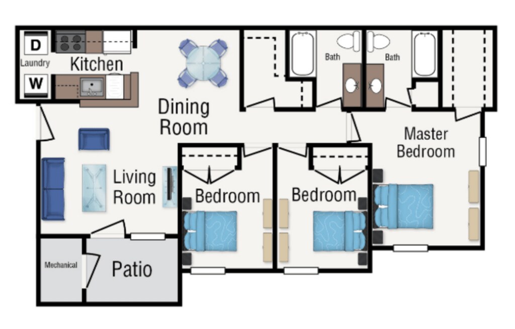 Modelo de apartamento: Three BedroomLlame para Precios3 Dormitorios, 2 Baños, 1185 sq ftNo Disponible![]()