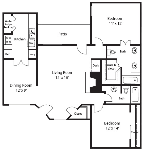 Modelo de apartamento: B12 Dormitorios, 2 Baños, 938 sq ftDisponible Ahora![]()