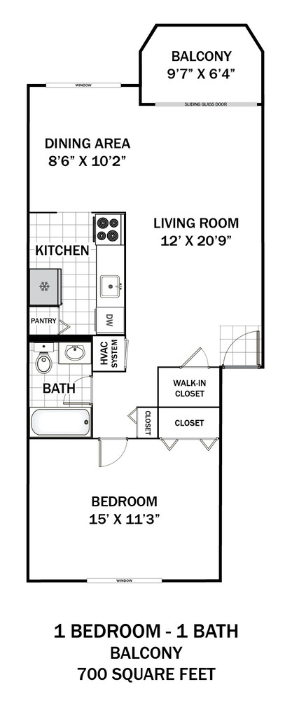1 Dormitorio, 1 Baño, 700 pies²Galería del Modelo